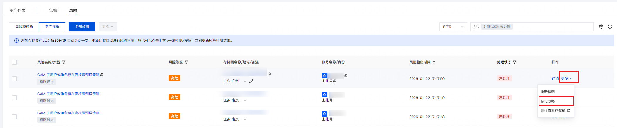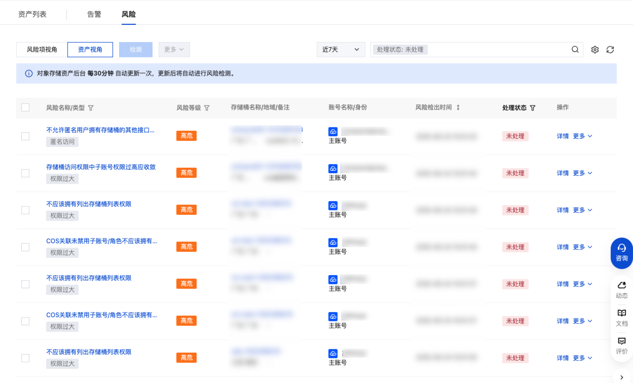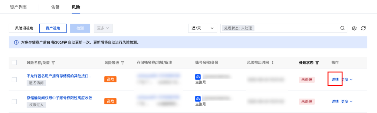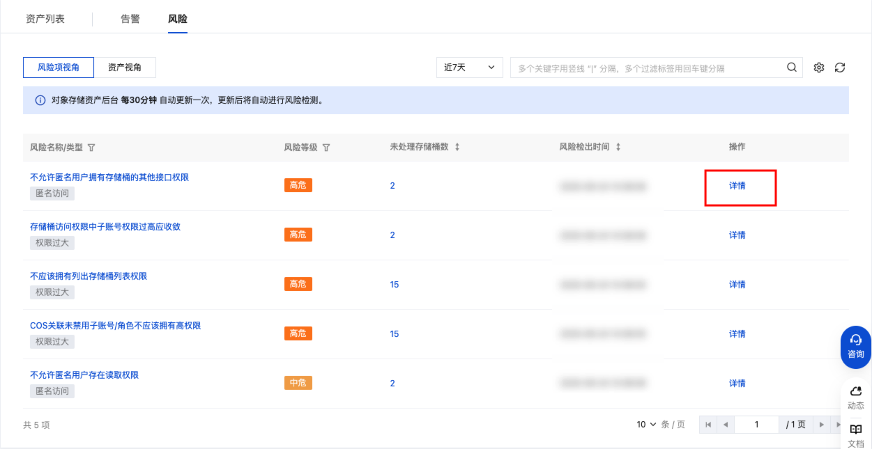 3. 在风险 > 风险项视角中,基于风险项视角自动化扫描存储桶权限配置,识别存在风险的存储桶,并展示风险检出时间以及风险等级。