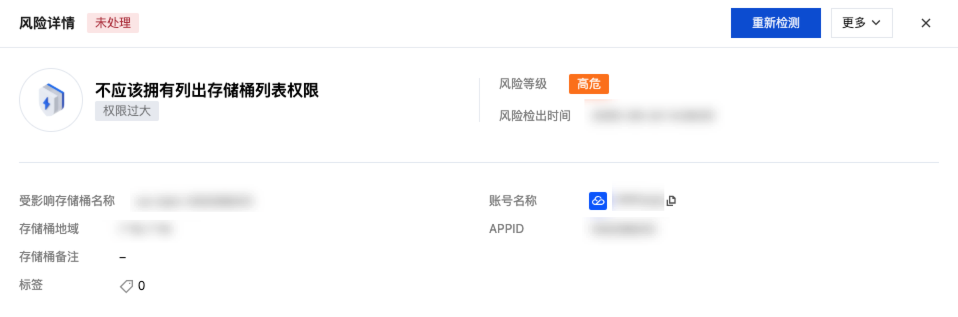 查看风险基本信息,风险基本信息包括:受影响存储桶名称、存储桶地域、存储桶备注、标签、账号名称、APPID。