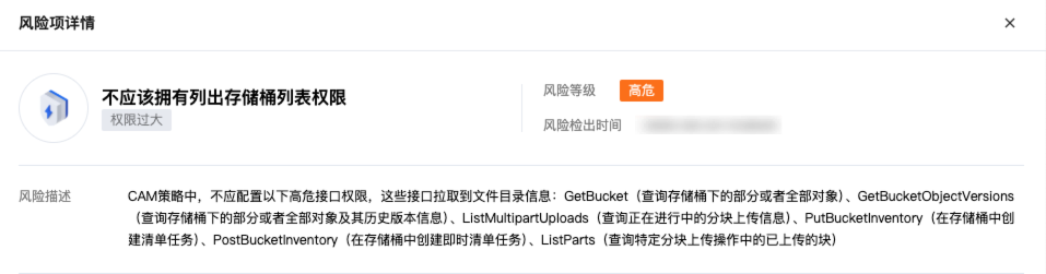 2. 在风险项详情页面,查看风险项基本信息、受影响存储桶以及配置建议。