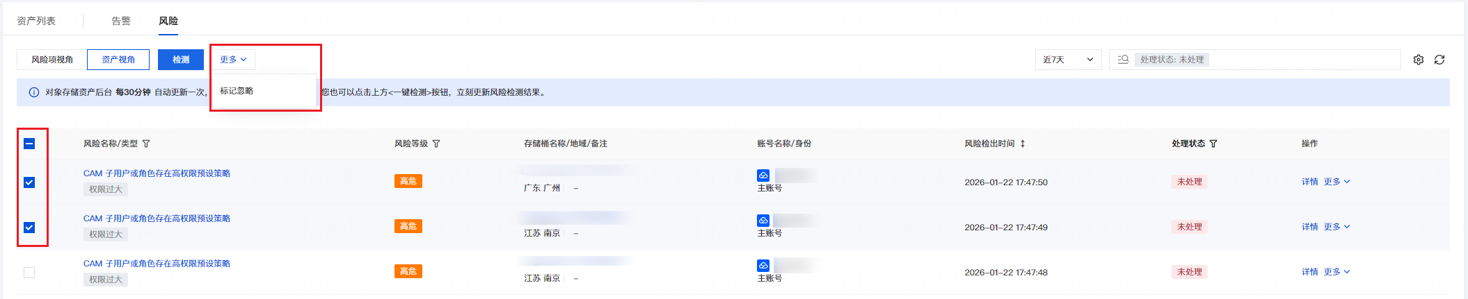 批量处置:在风险页面,选择多个目标风险,单击更多 > 标记忽略。