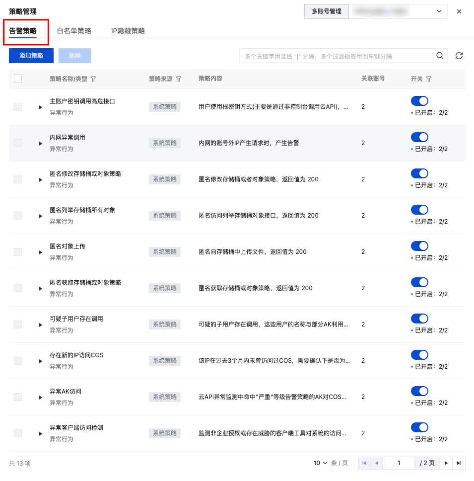 3. 在策略管理窗口中,单击告警策略标签。对告警策略进行管理,目前支持开启/关闭具体的告警策略以及添加告警策略、快速定位命中策略的告警。