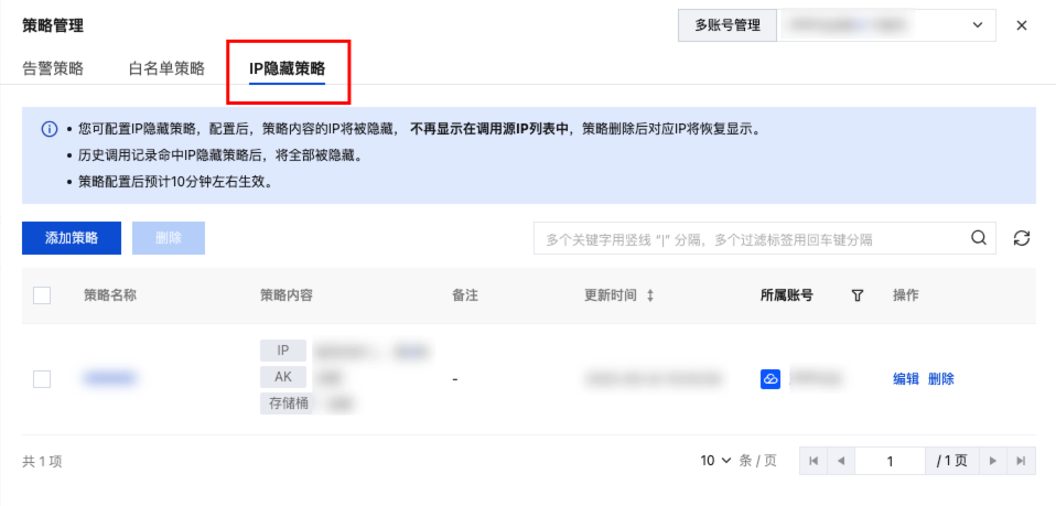 IP 隐藏策略配置后,策略内容的 IP 将被隐藏, 不再显示在调用源 IP 列表中,策略删除后对应 IP 将恢复显示。