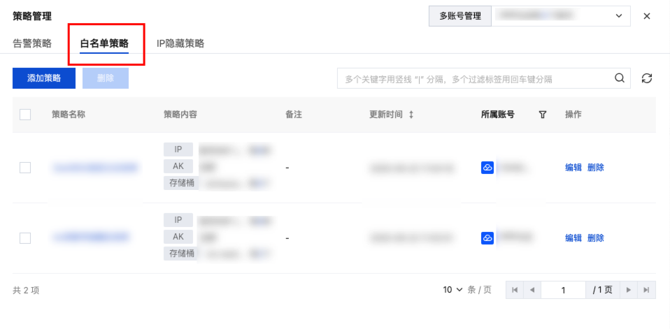 3. 在策略管理窗口中,单击白名单策略标签。对白名单策略进行管理,支持基于调用源 IP、调用 UA、域名、存储桶、文件路径、AK、接口、返回码进行加白,并指定生效范围。