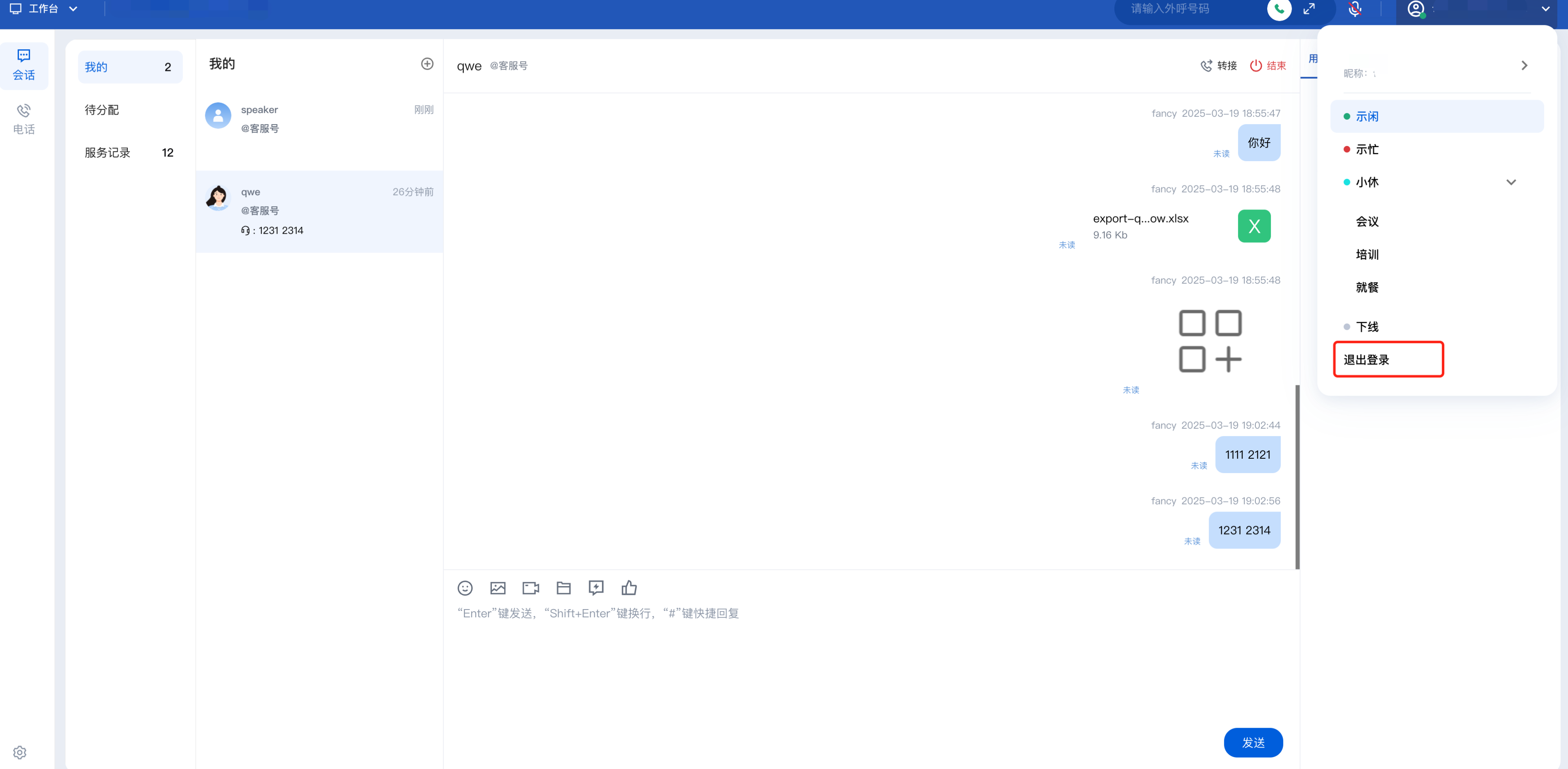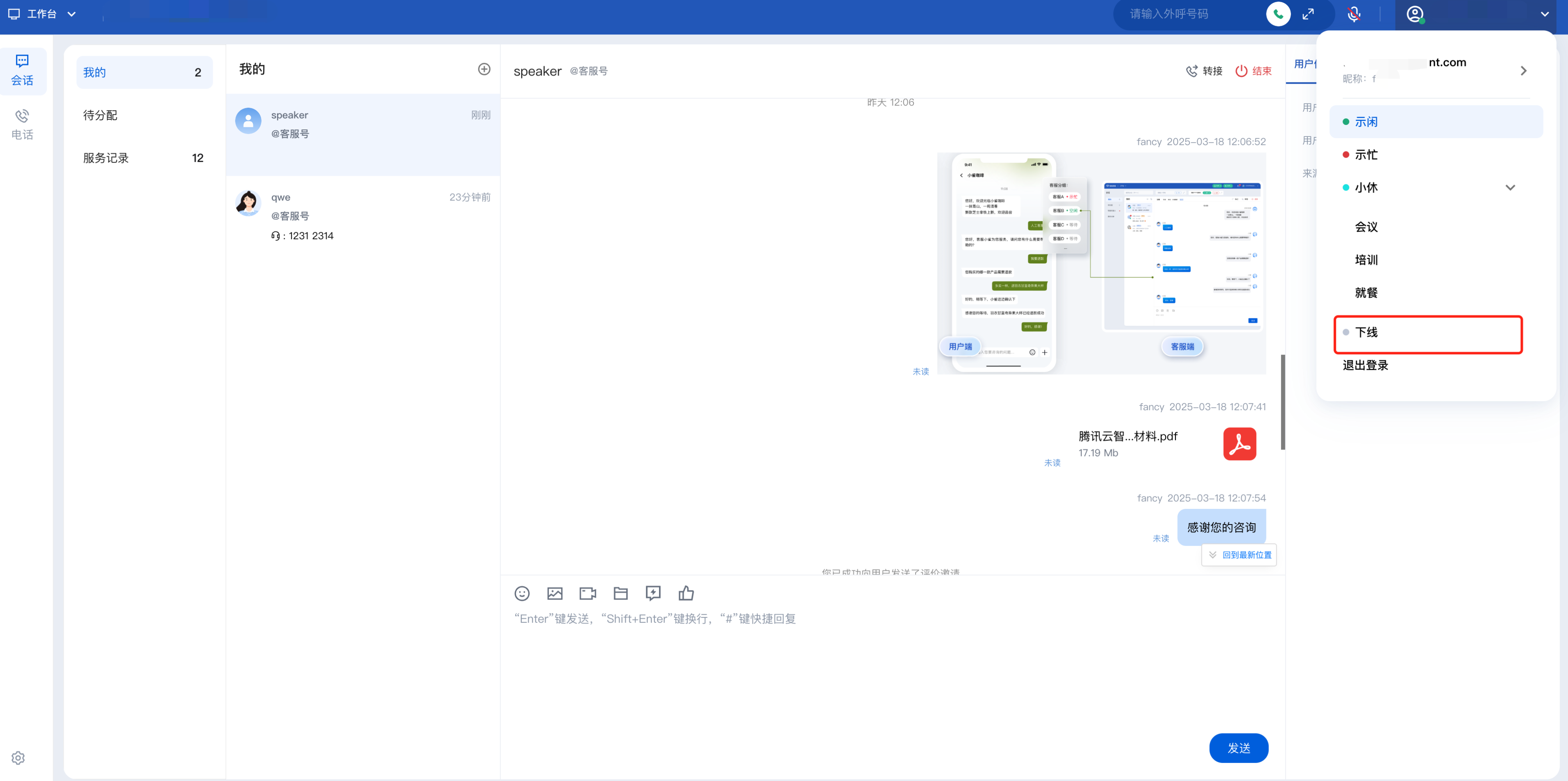 下线后,员工状态为离线状态,系统不会给该员工分配会话,员工可手动切换为上线状态。