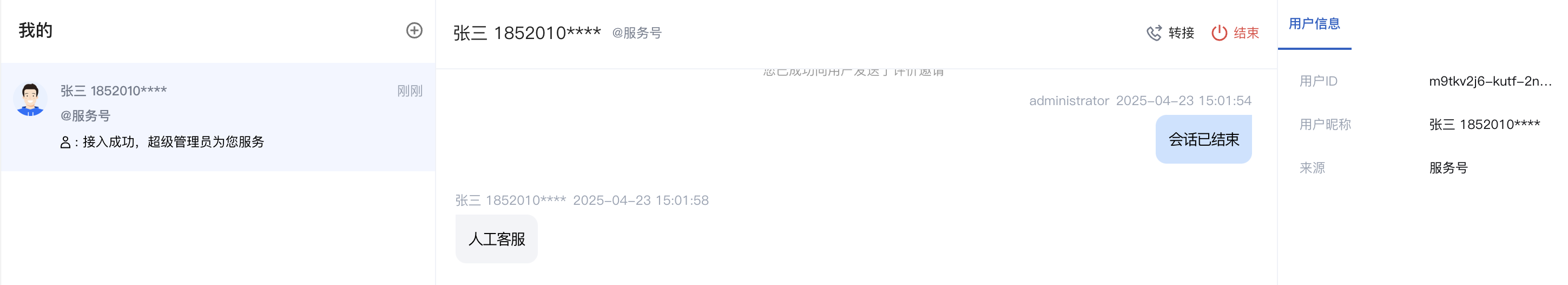 initWithProfile 方法登录智能客服。此接口支持同时设置用户的昵称和头像,可与业务侧账号体系打通。如果您希望人工客服在工作台接待用户咨询时,能看到用户的昵称、头像等信息以提升沟通效率,请在登录时设置 nickName 和 avatar 参数。效果如下图所示: