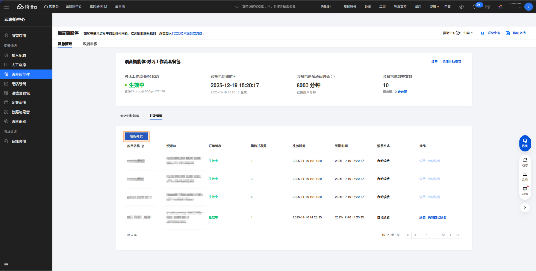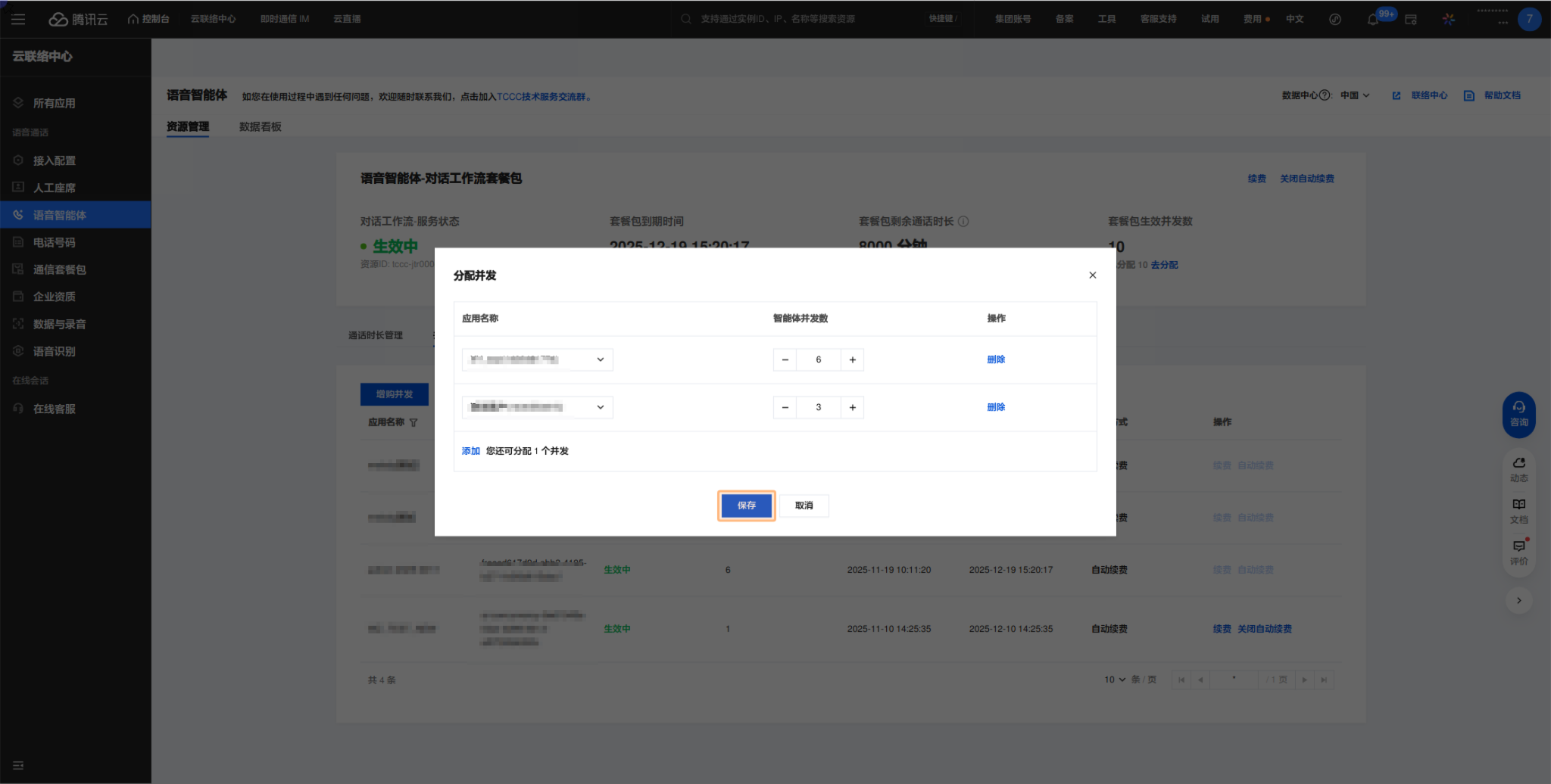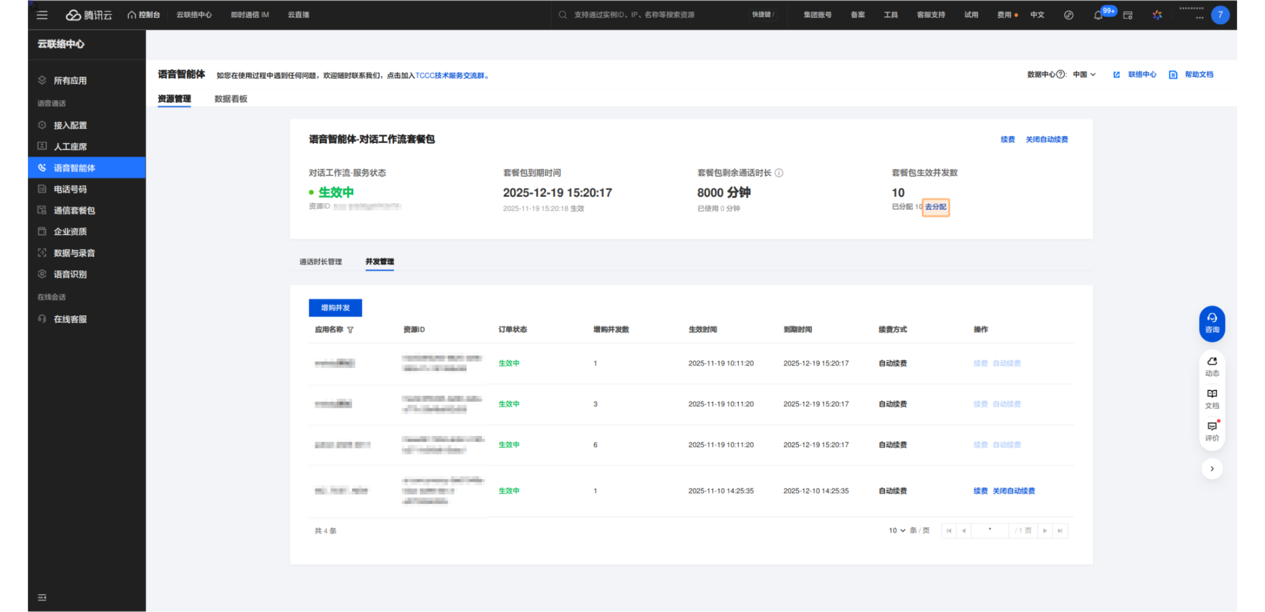 3. 购买完成后可以在 云联络中心控制台,左侧导航栏单击语音智能体查看套餐包有效期、套餐包剩余通话时长、套餐包内生效并发数。初次购买套餐包后需单击去分配将套餐包内并发分配至指定应用,并发即可生效。