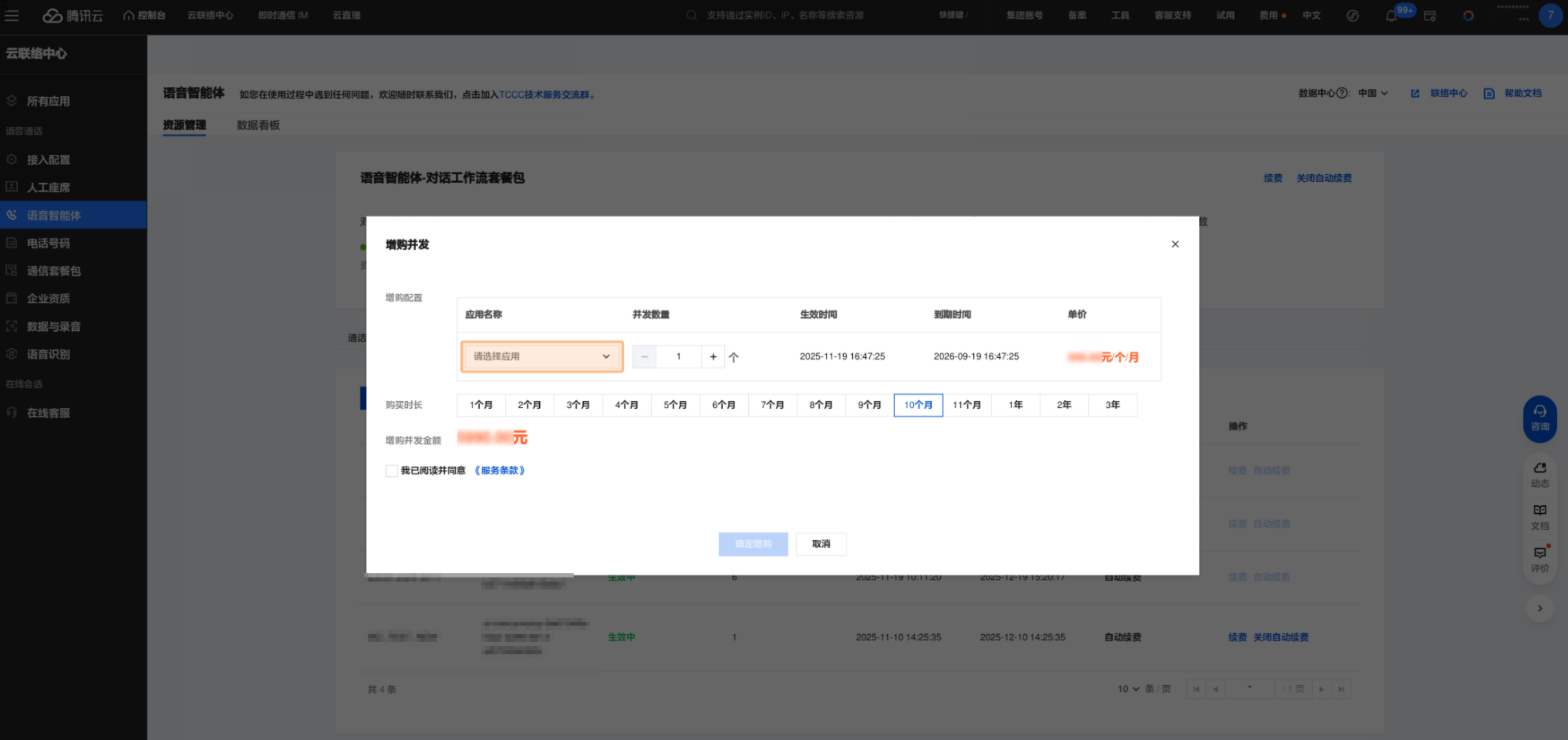 1. 进入 云联络中心控制台,在左侧导航栏选择语音智能体 > 并发管理,单击增购并发。