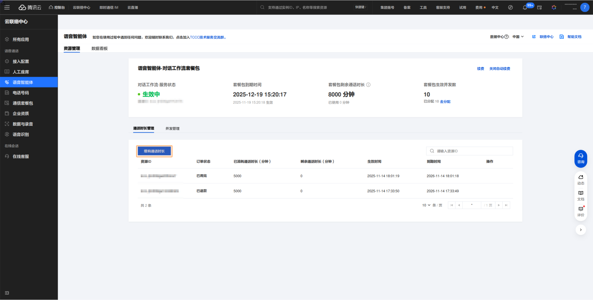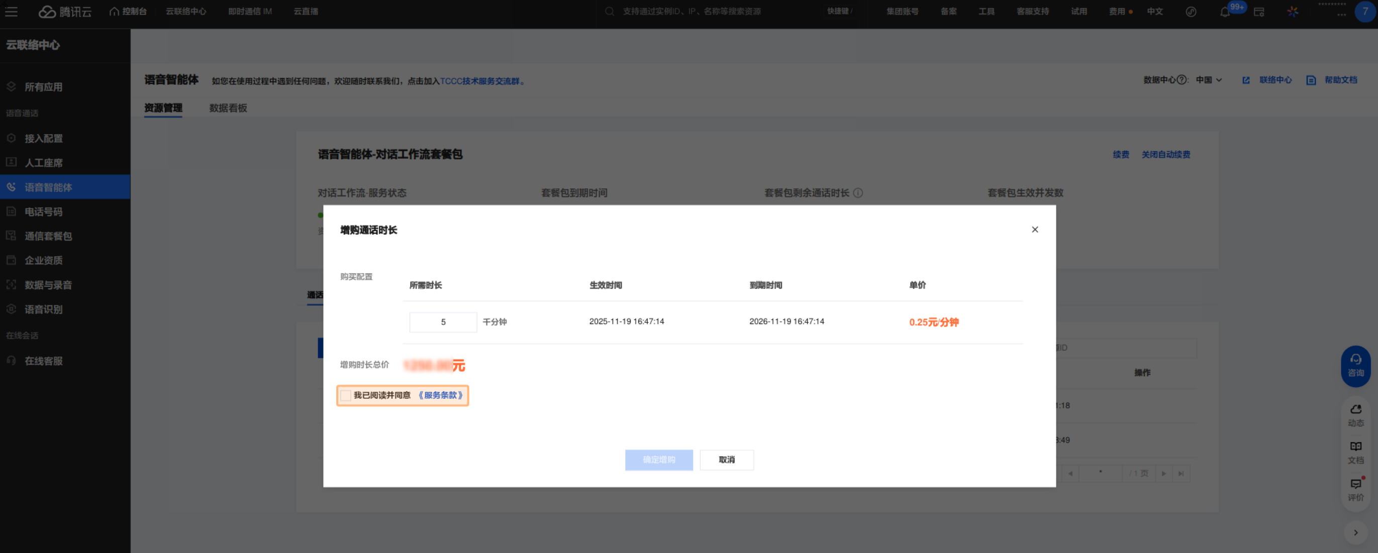 1. 进入 云联络中心控制台,在左侧导航栏选择语音智能体,单击增购通话时长。