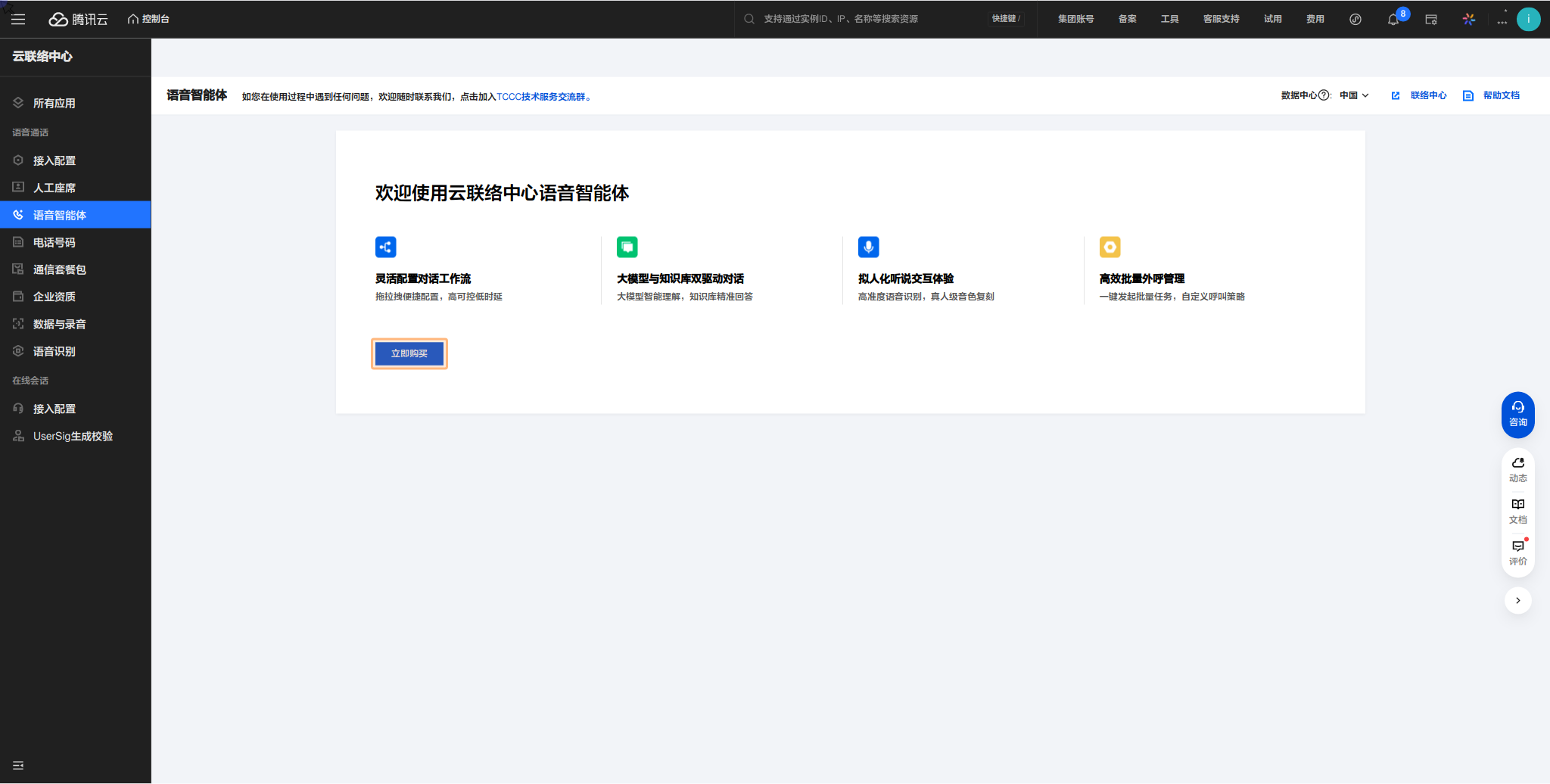 1. 进入 云联络中心控制台,在左侧导航栏选择语音智能体,单击立即购买。