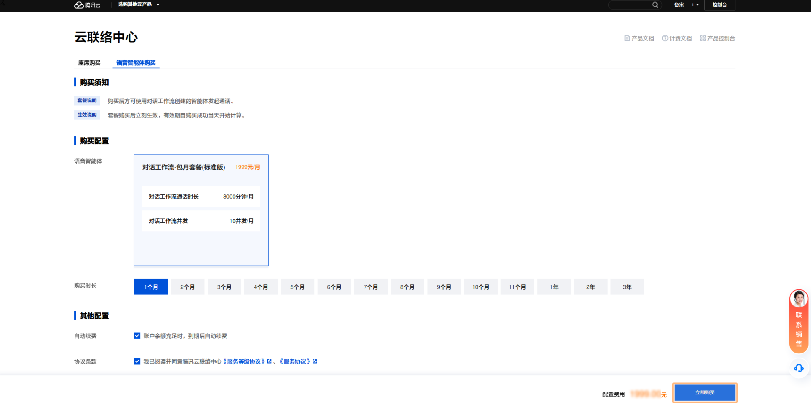 2. 选择语音智能体购买,确认包月套餐购买时长和自动续费配置后单击立即购买,支付完成即可。