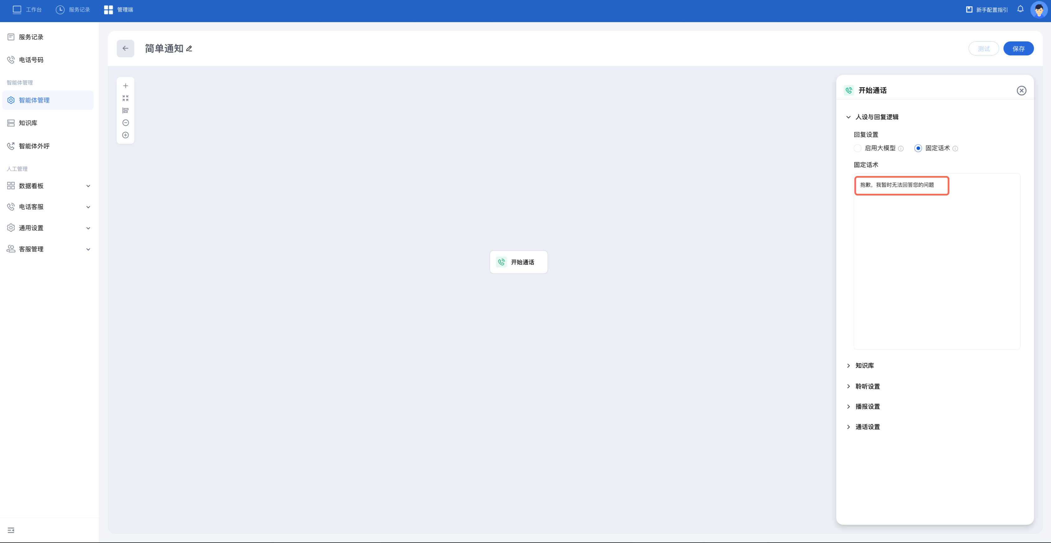 参考图片,输入自定义话术并设置用户回复分类,连接开始通话节点和新增的对话节点,关闭聆听用户回复按钮。