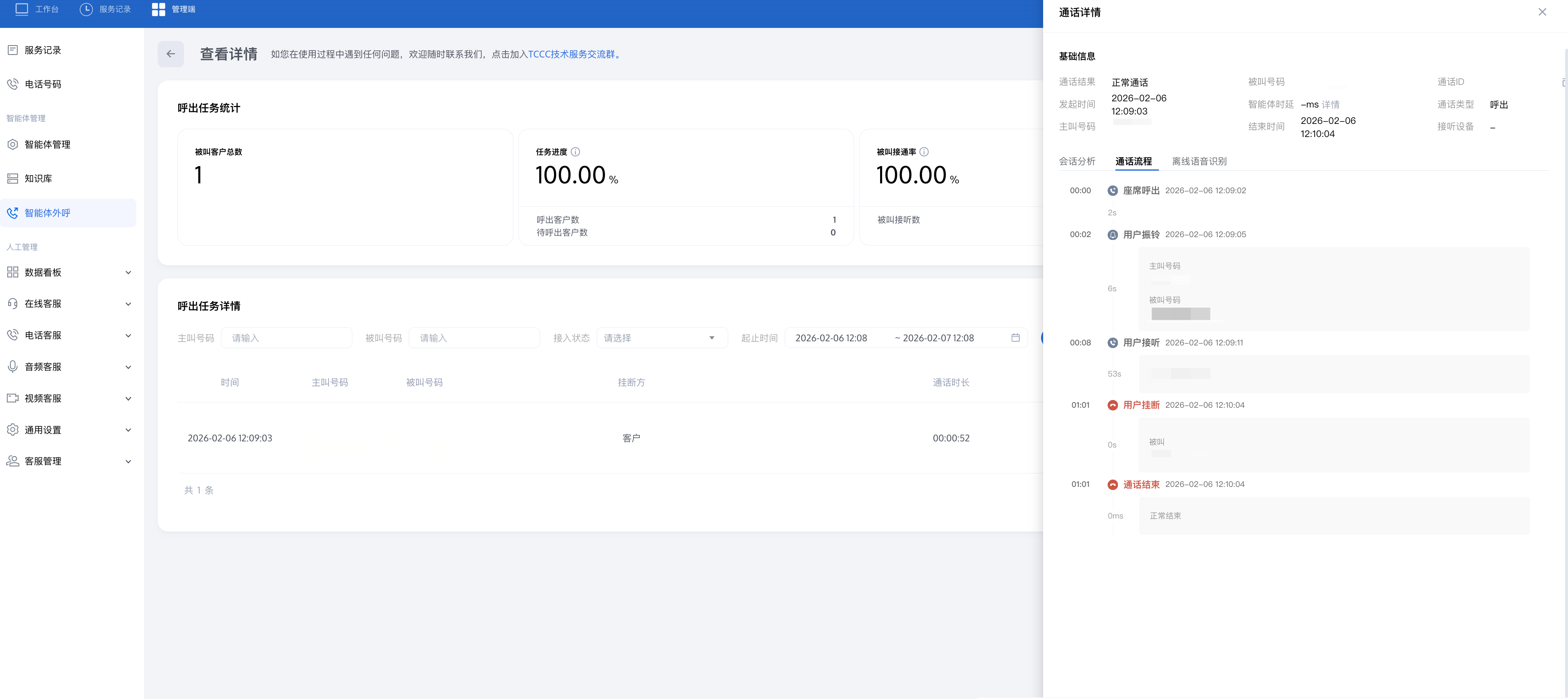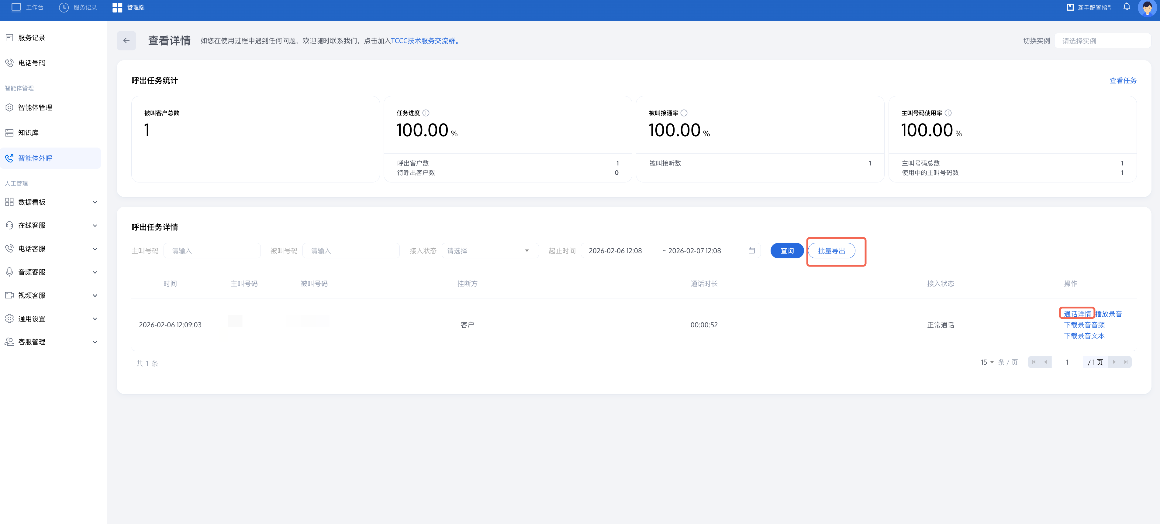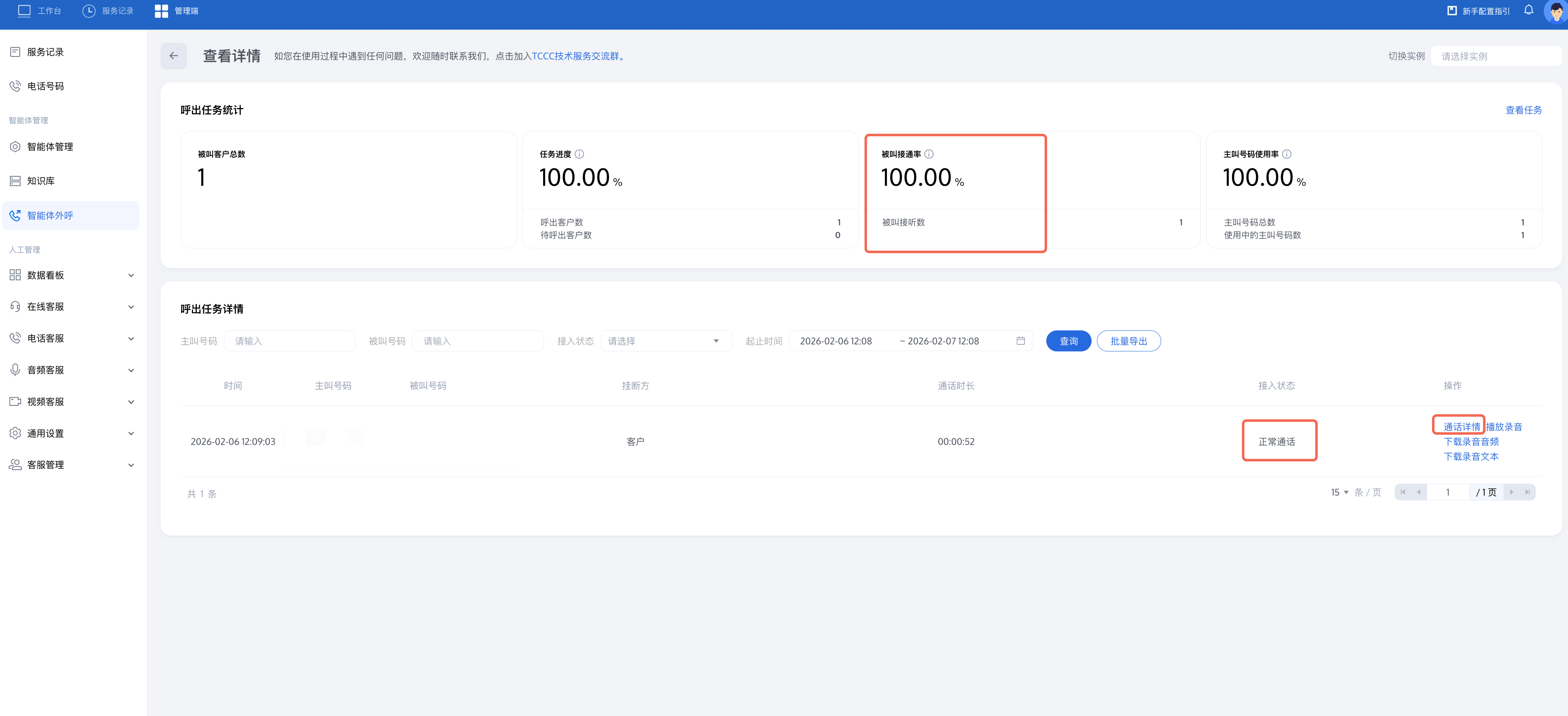 您可以看到该外呼任务的接通率和每通电话的接入状态并定位未接听原因。