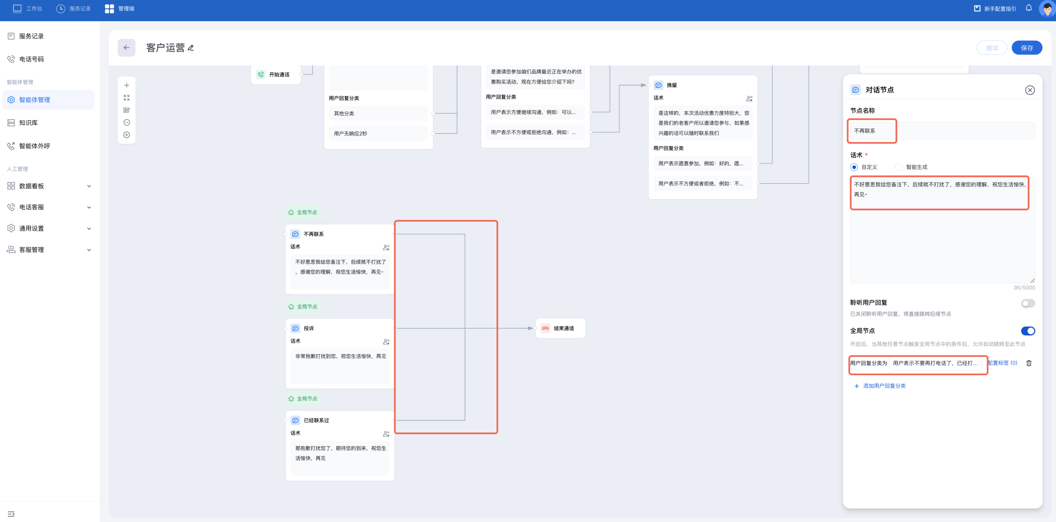 5. 在对话过程中,用户可能随时拒绝继续沟通。若用户在任意节点就表示出不愿意了解、投诉或已沟通过,您可以参照下图设置全局节点并结束对话。全局节点开启后,当其他任意节点触发全局节点中的条件后,允许自动跳转至此节点。