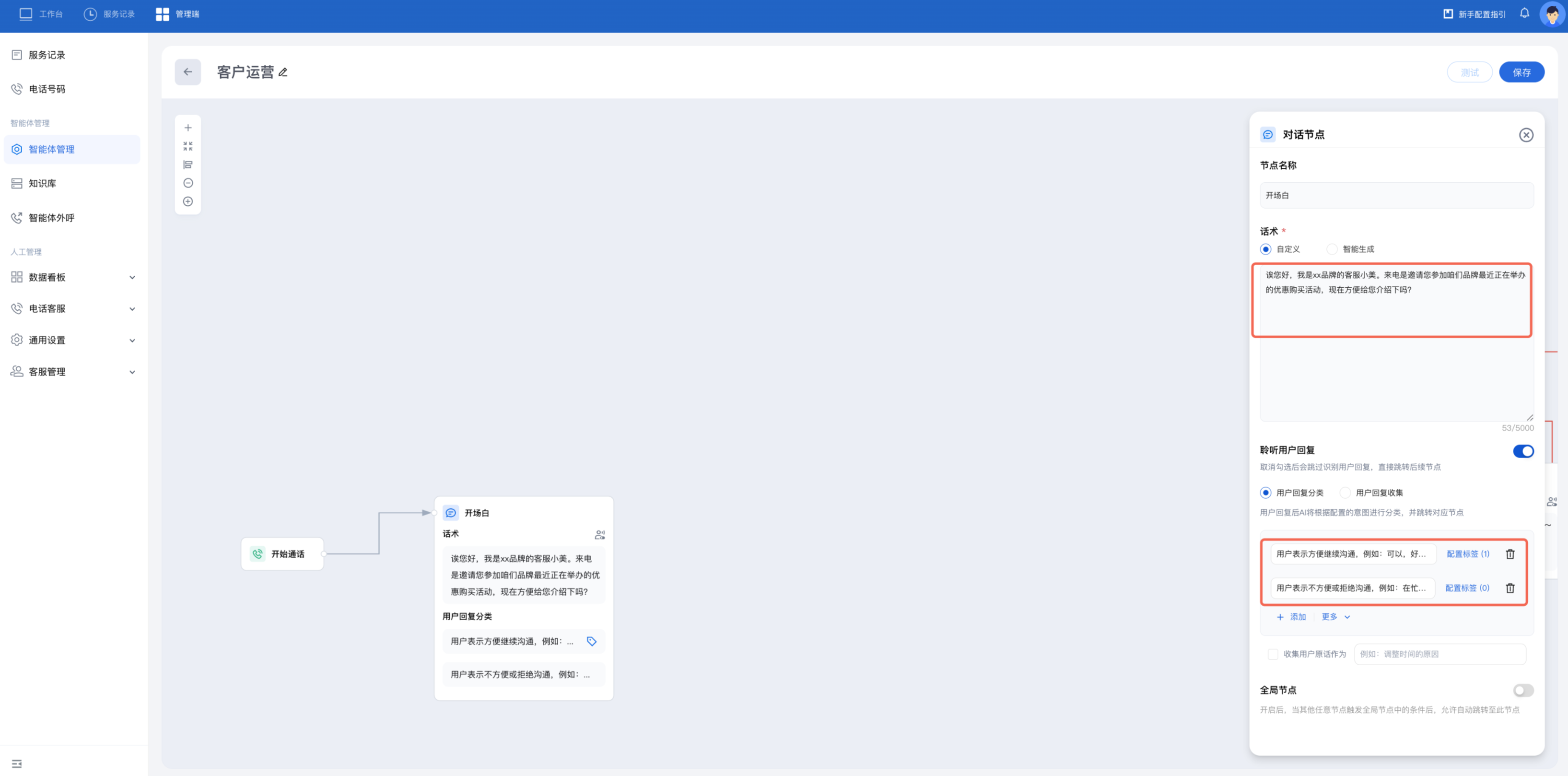 新增对话节点作为开场白,向用户说明电话来意。设置用户回复分类为方便继续沟通和不方便或拒绝沟通。每类回复建议列举用户可能的回复,例如:可以,好的等,帮助大模型更好地理解该意图。
