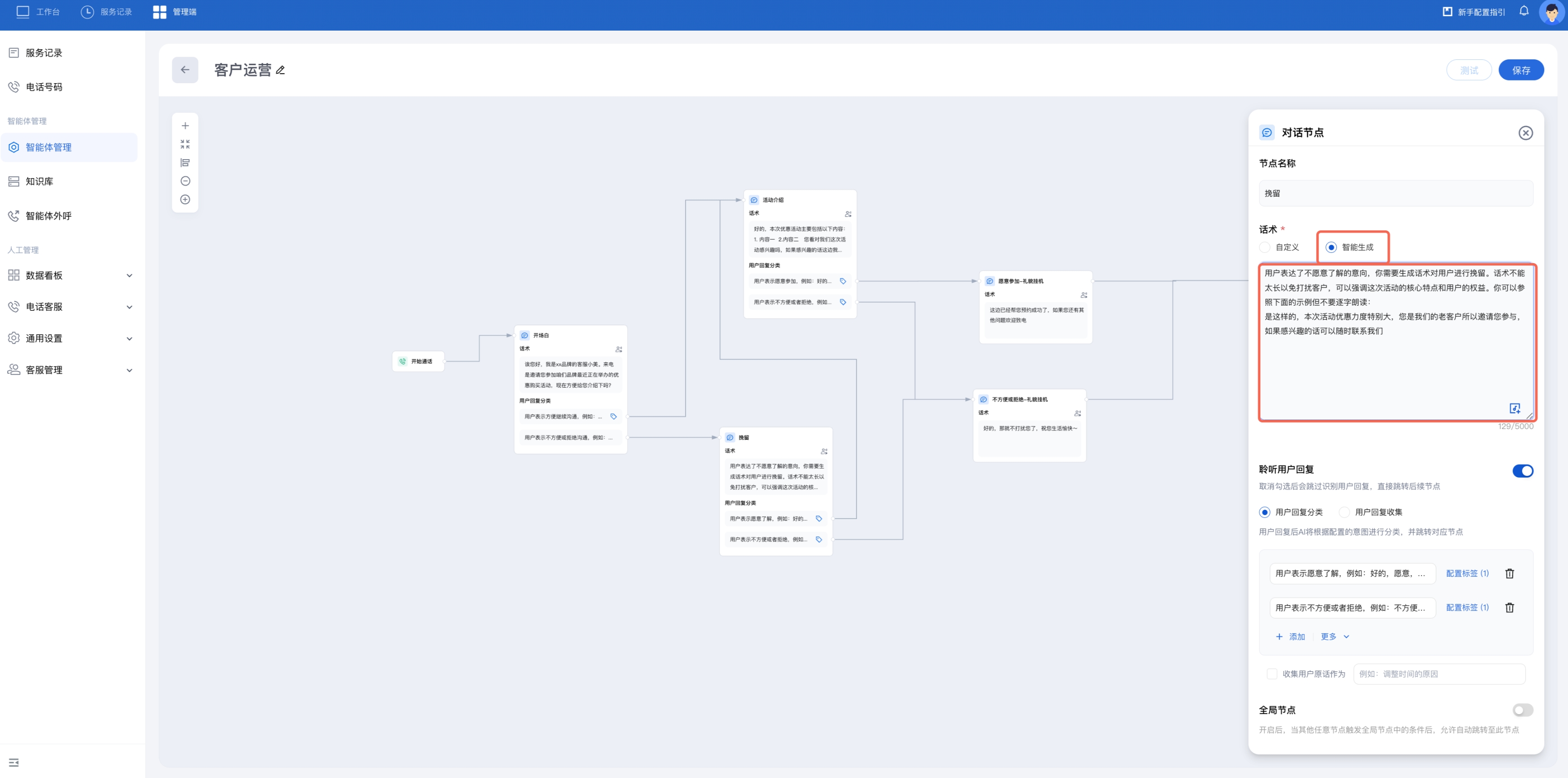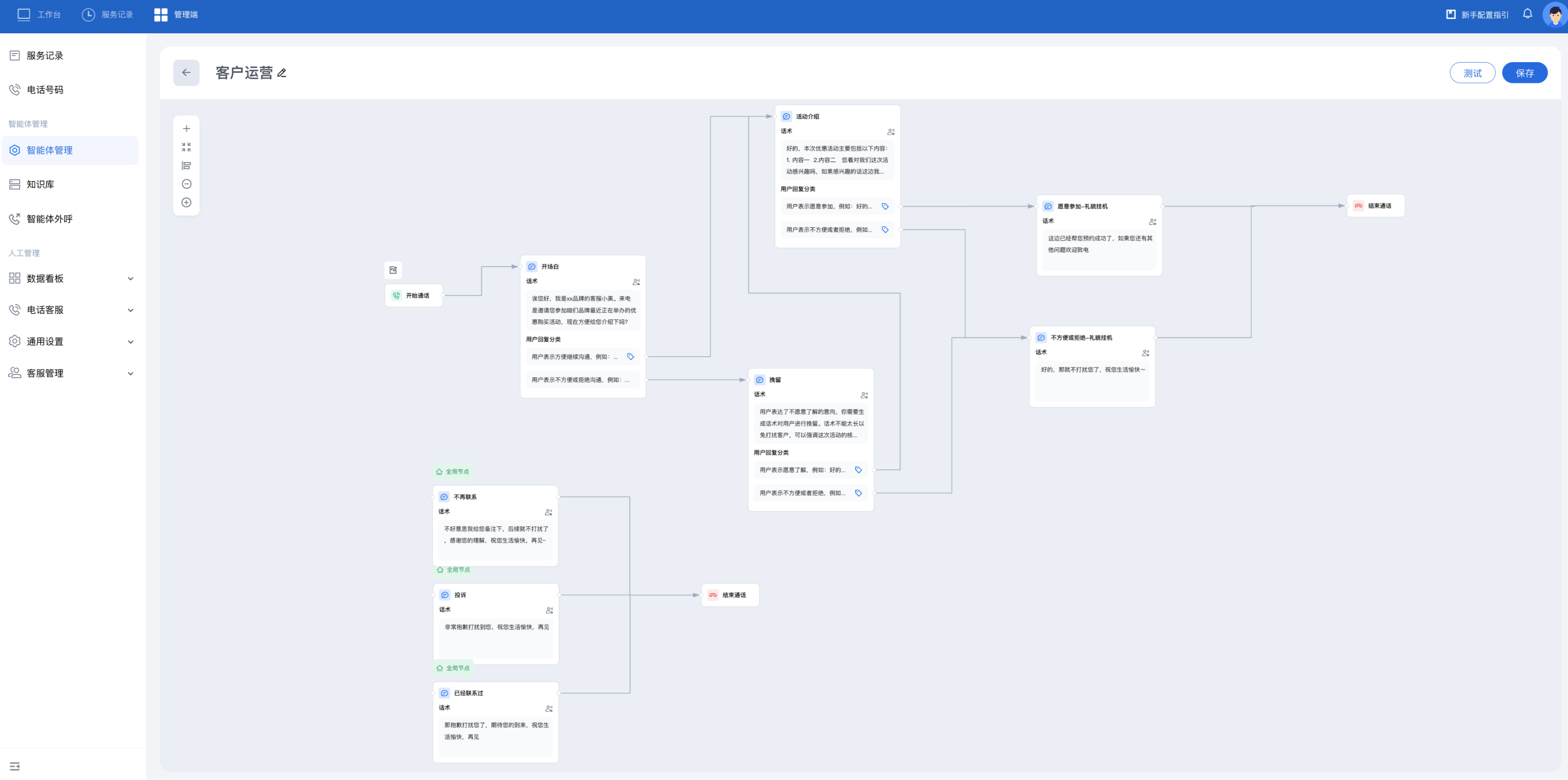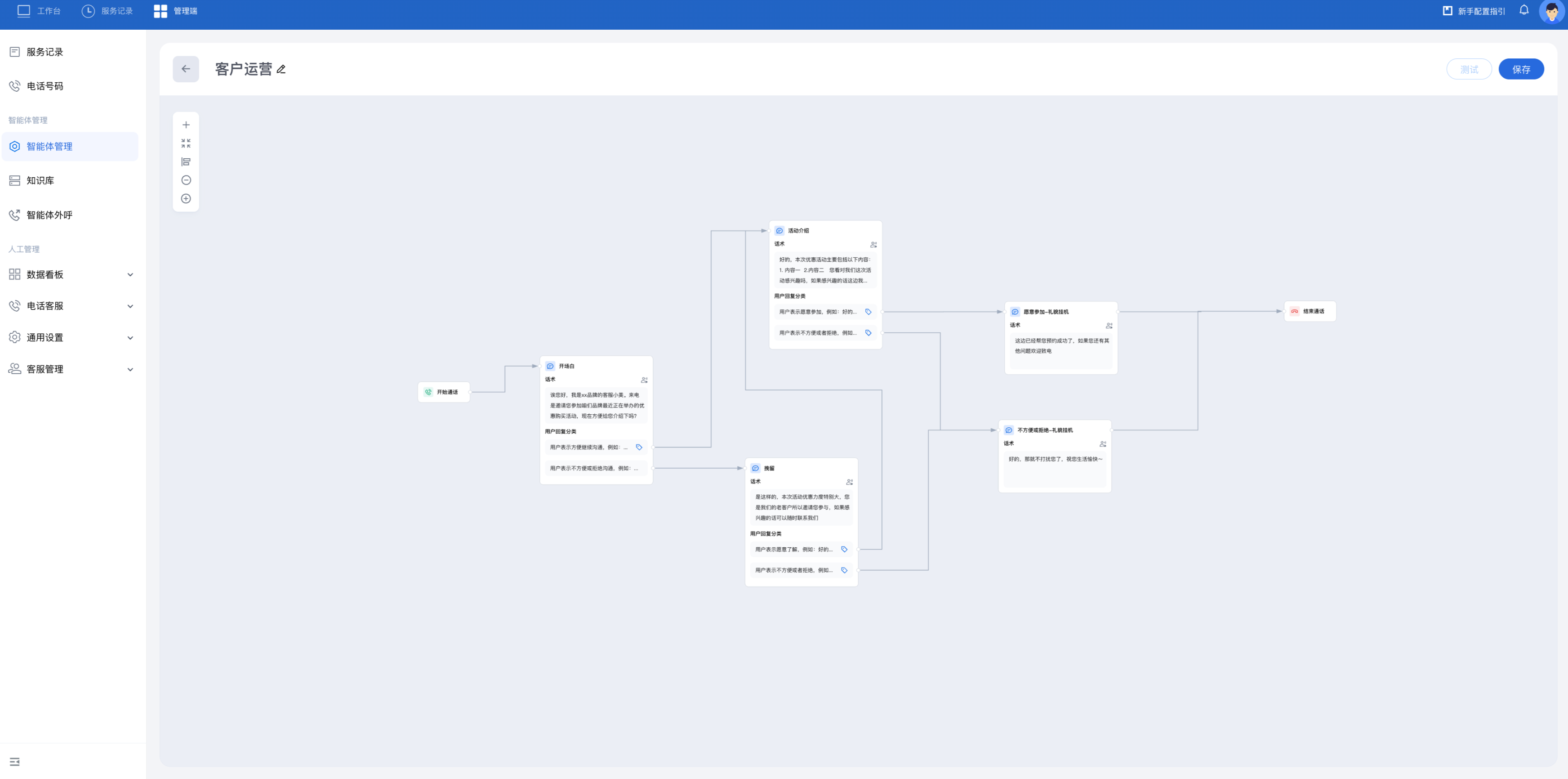 3. 您可以参照下图继续增加节点并设置话术和用户回复分类。在正常介绍流程外,该流程可对无意向用户进行挽留。若挽留成功,进入活动介绍节点。若挽留失败,进入礼貌挂机节点。