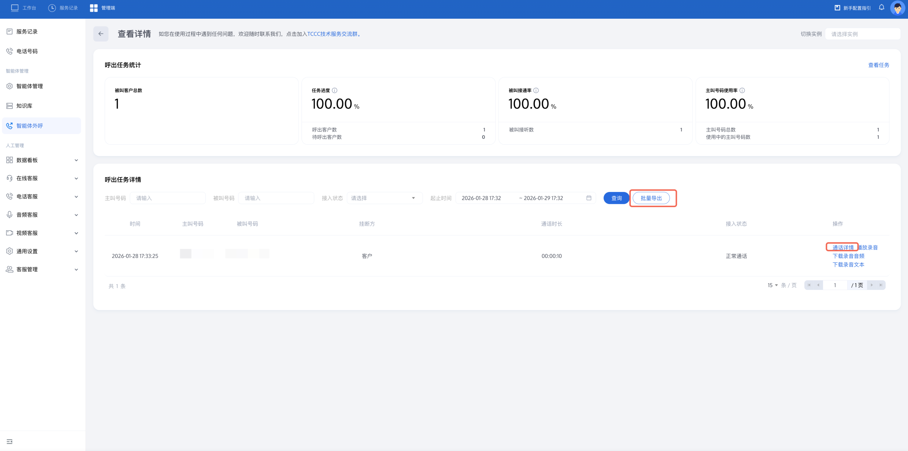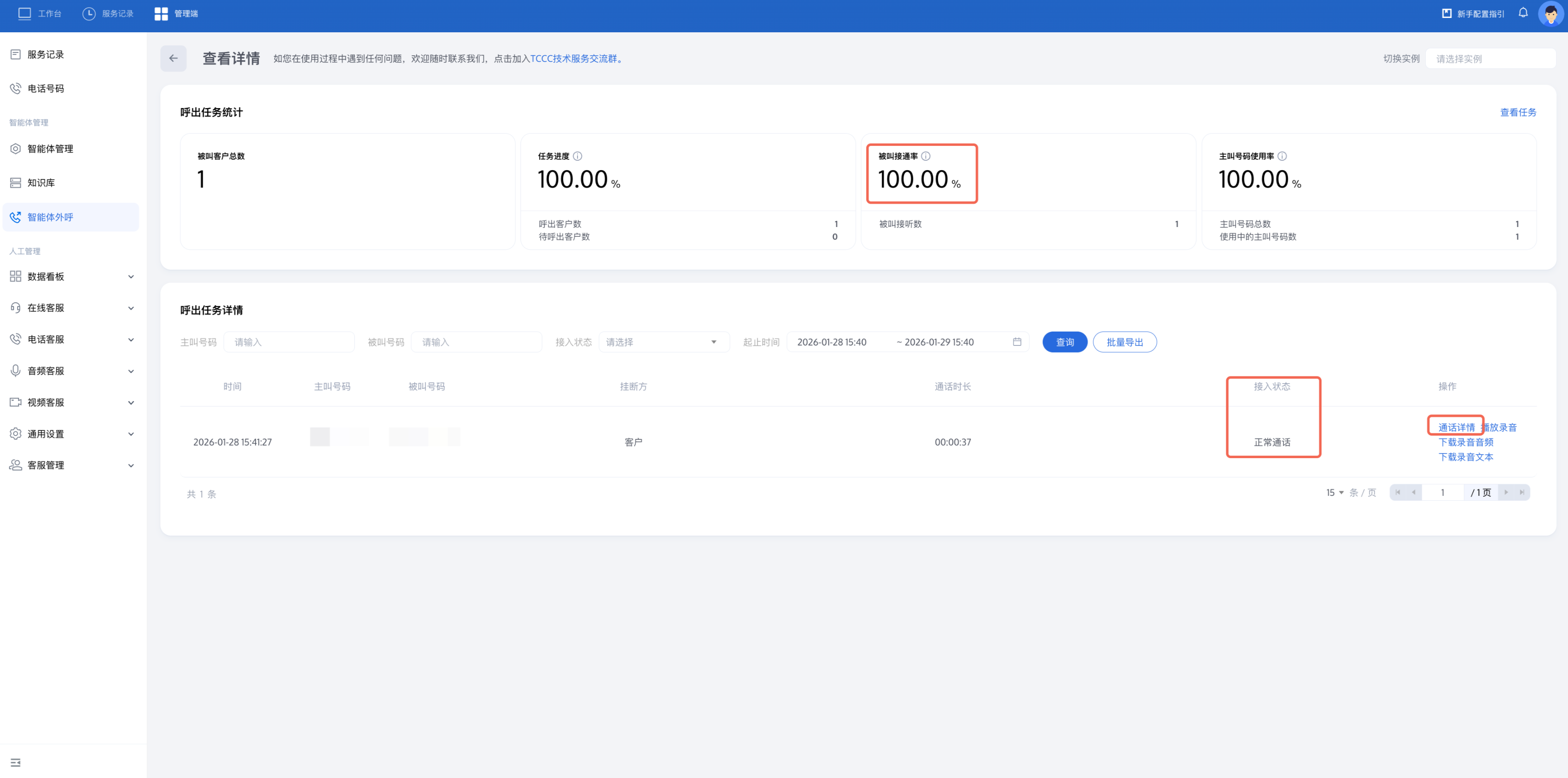 您可以看到该外呼任务的接通率和每通电话的接入状态并定位未接听原因。