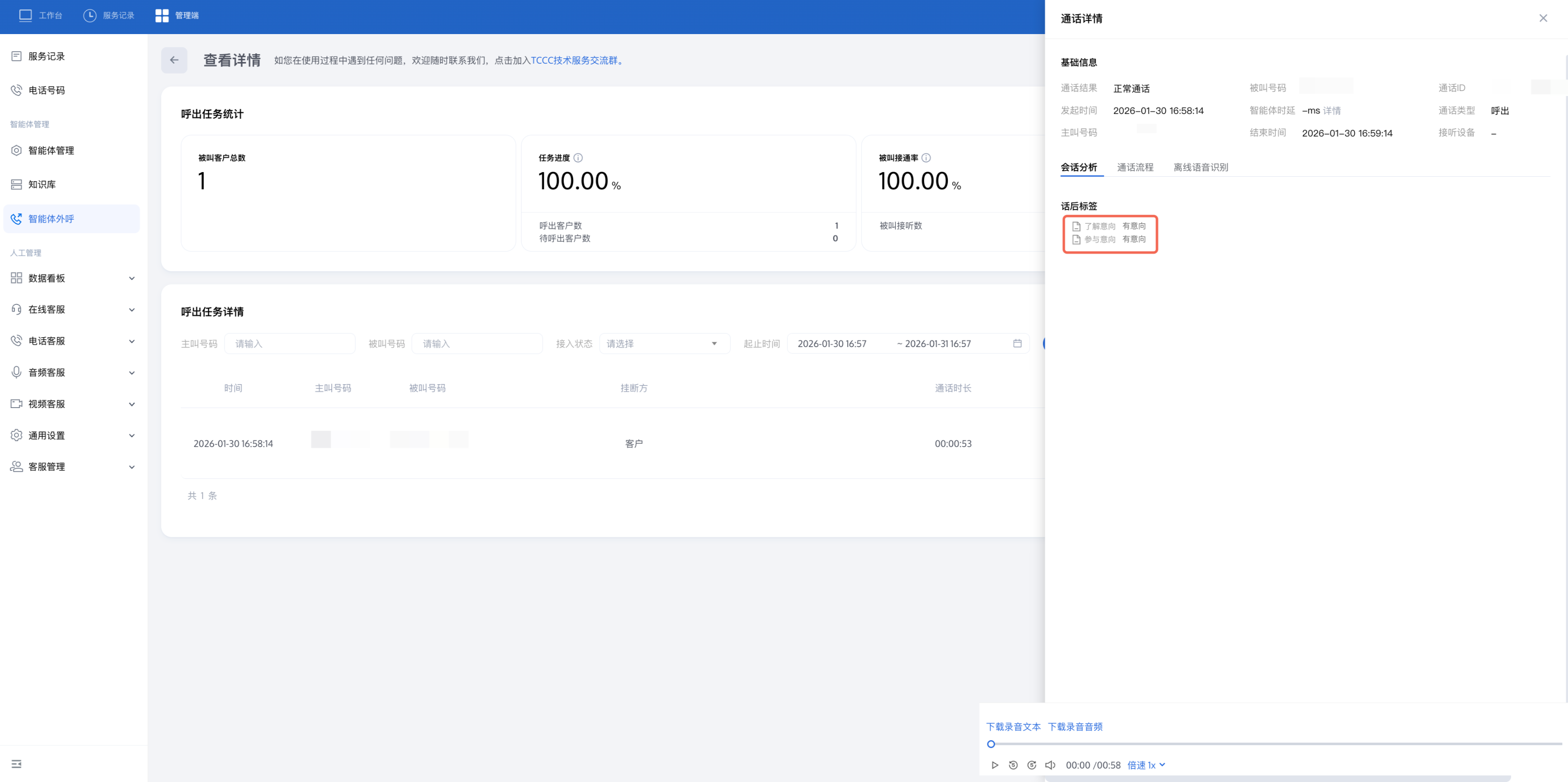 创建并执行完智能体外呼任务后,您可以查看对话数据,包括通话接通情况、用户意向等: