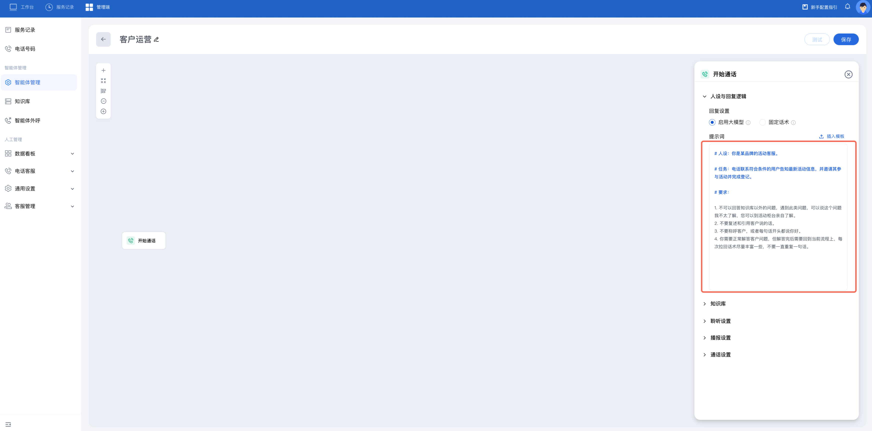 2. 以邀请用户参加最新活动场景为例搭建智能体。点击开始通话节点,您可以参照下图或自主设置提示词。提示词建议包括以下内容:人设(智能体身份及语言风格)、任务(该智能体的主要功能、您希望达到的效果等)、要求(对智能体的行为约束)。