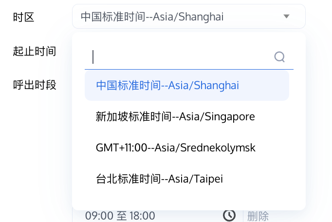 时区:点击下拉框,您可以直接在列表中选择,或通过输入关键词(如“北京”、“GMT+8”)进行搜索。您后续设置的起止时间和呼出时段,都将以此处选择的时区为准。