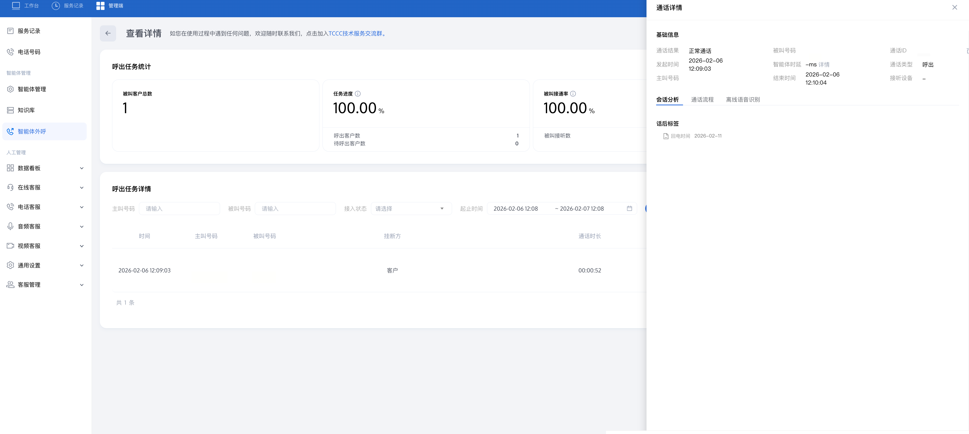 智能体外呼是管理端用于创建并管理智能体自动外呼的功能模块,您可以在该模块中完成创建批量自动外呼任务、自动执行以及查看任务结果。本文旨在帮助您了解智能体外呼功能,为智能体外呼任务创建到完成全流程提供指引。