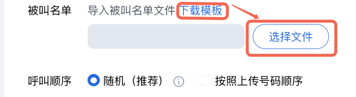 导入被叫名单及设置呼叫顺序:在此区域,您可以导入被叫名单文件并设置呼叫顺序。首次使用时,请先下载模板并按格式填写,完成后点击选择文件上传。上传成功后,您可在下方选择随机顺序或按照上传号码顺序进行呼叫。