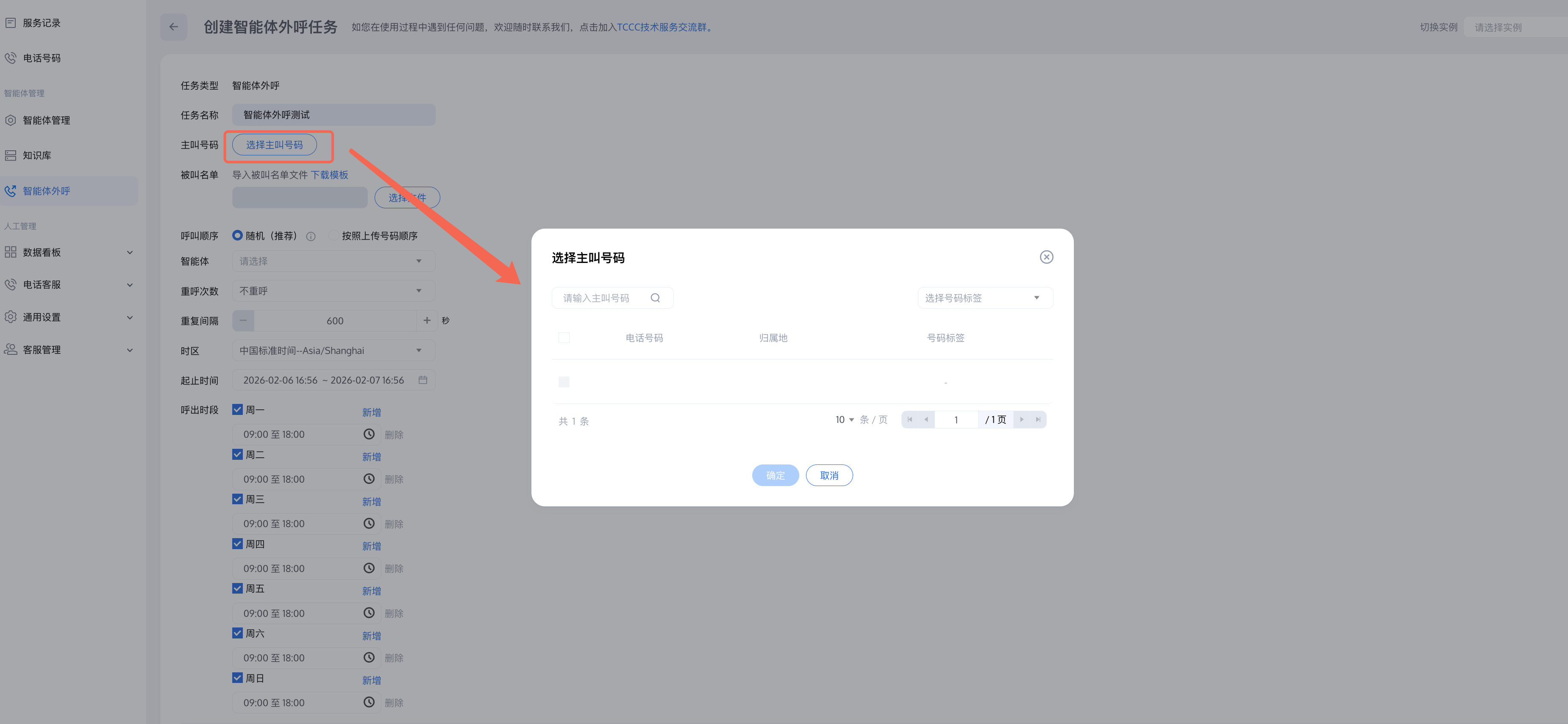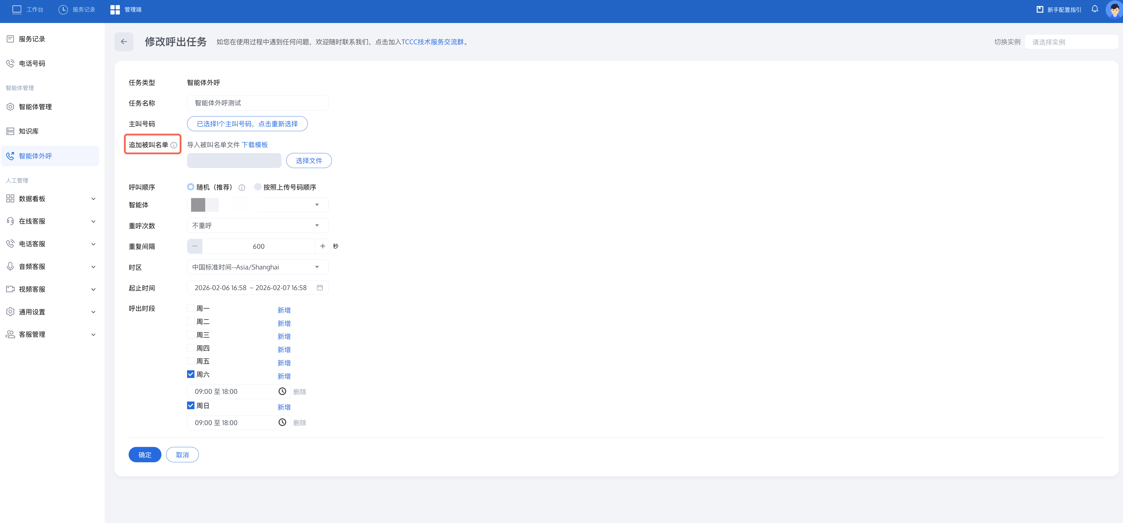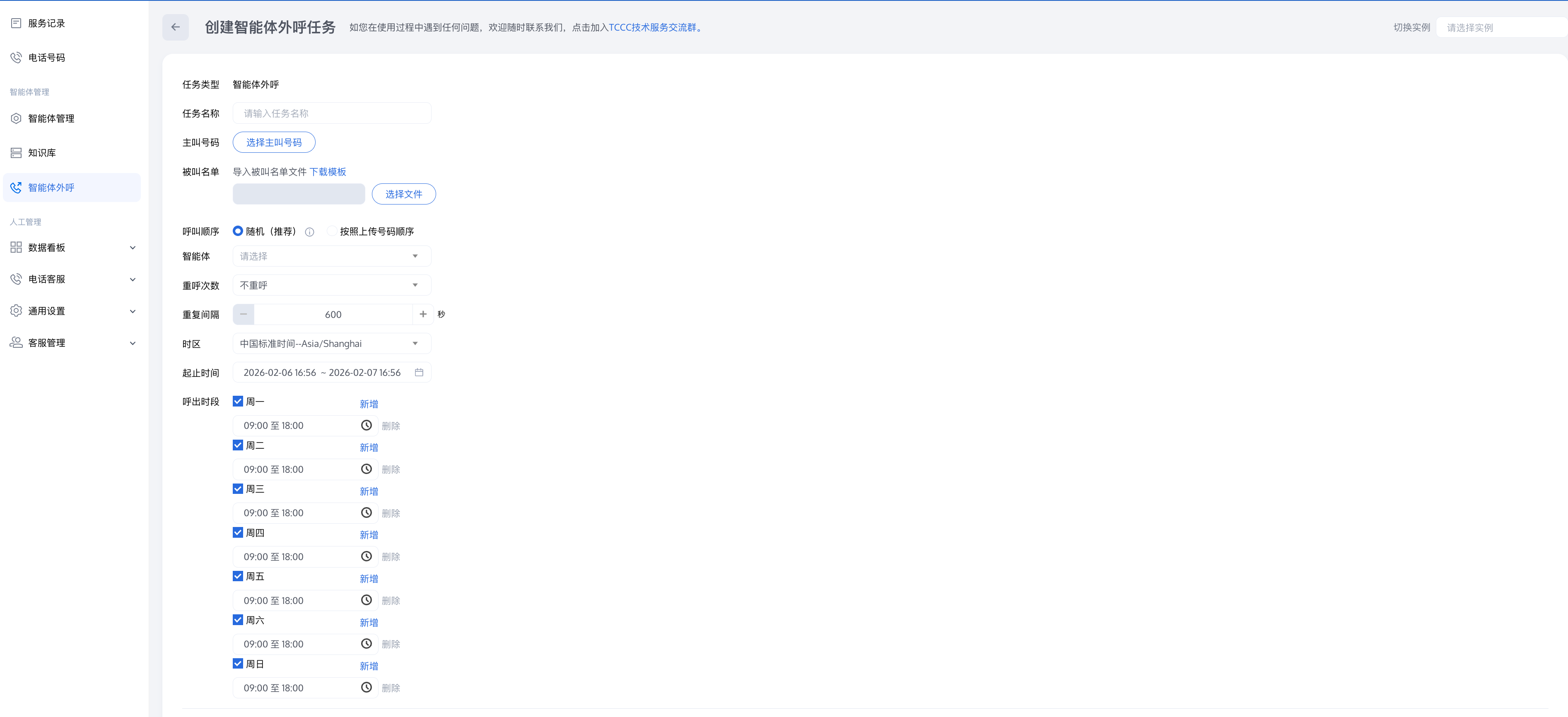 2. 智能体外呼任务设置:点击添加任务按钮后,进入智能体外呼任务设置界面。您可以设置智能体外呼的任务名称、主叫号码、被叫名单和呼出时间设置等。