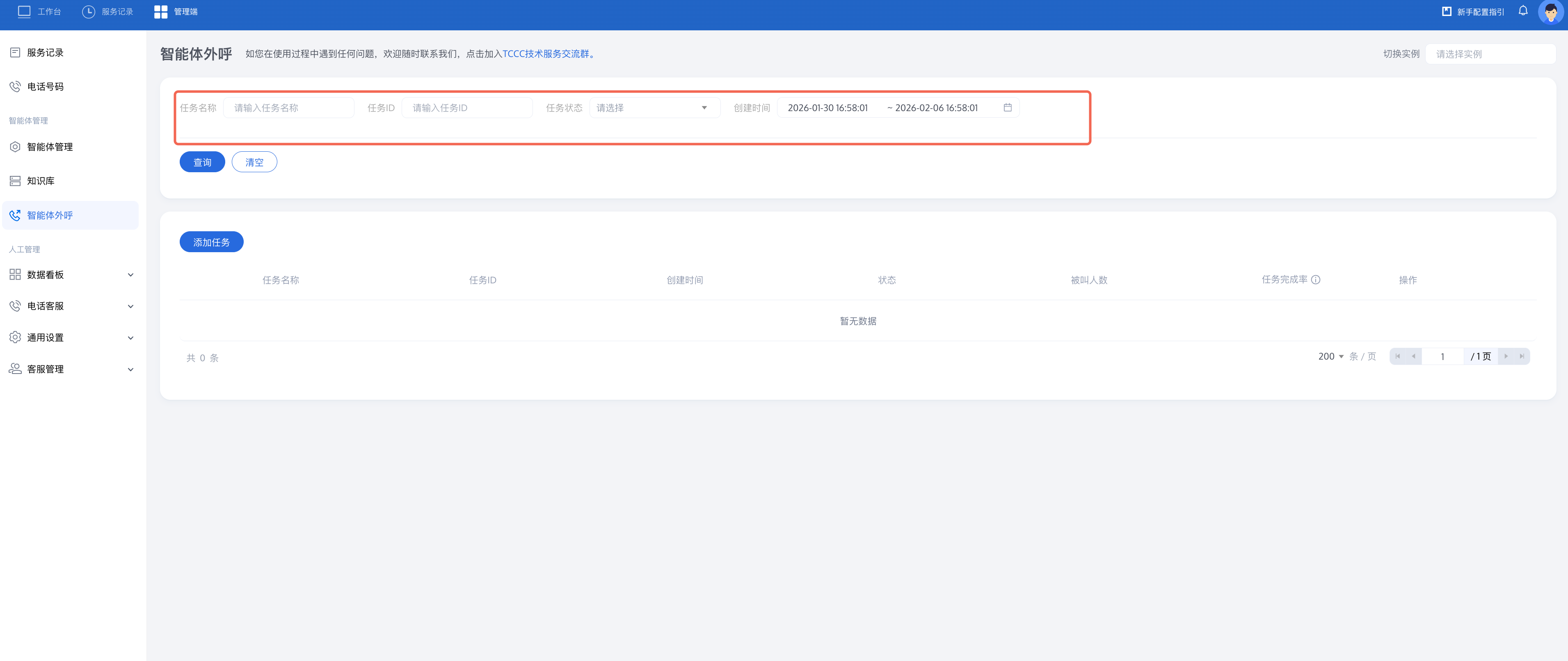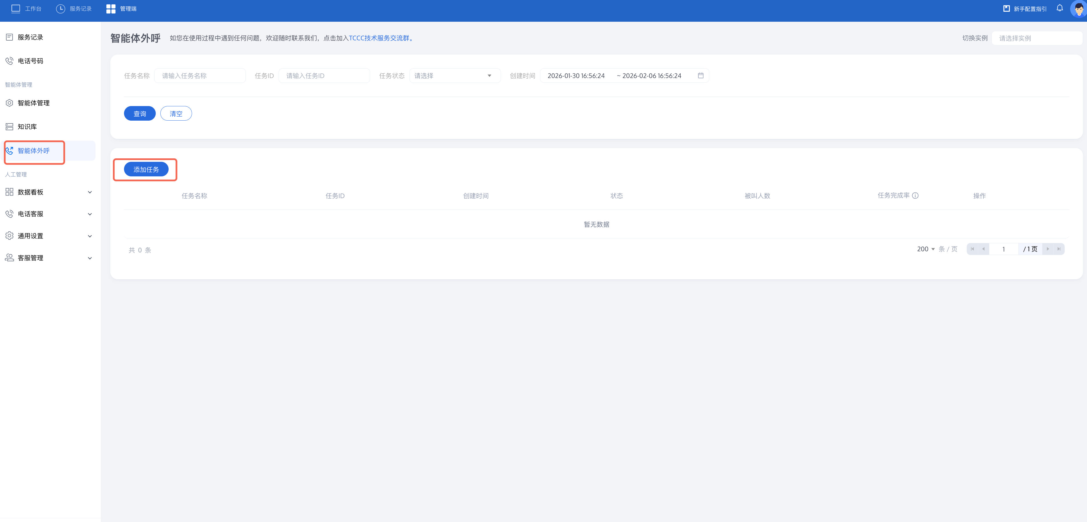 1. 新建智能体外呼任务:登录 腾讯云联络中心 TCCC 管理台,单击左侧的智能体外呼 > 添加任务,新建一个智能体外呼任务。
