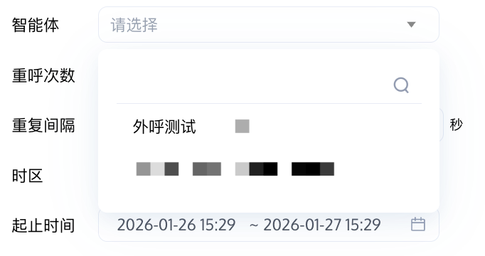 智能体选择及并发设置:点击智能体选择框,您可以在下拉列表中选择或搜索您需要执行外呼任务的智能体。