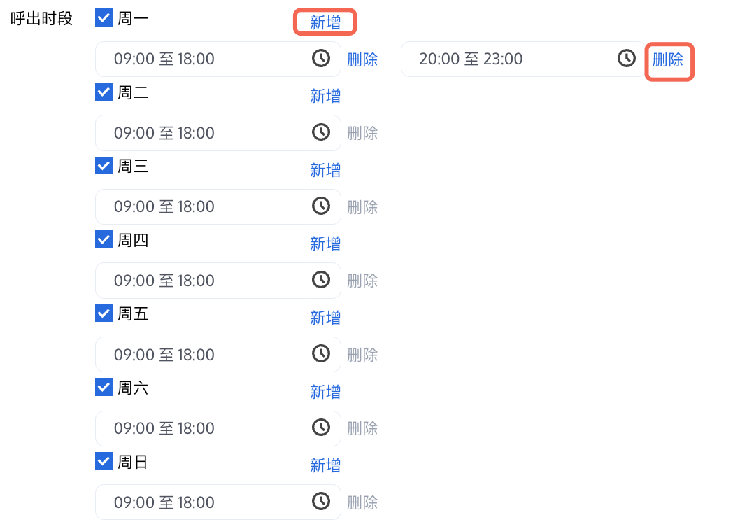 呼出时段:您可以根据业务需要勾选需要执行智能体外呼任务的每周具体日期(周一到周日),并可以修改、新增或删除每天的具体呼出时段,支持设置一天多个时段呼出。所有时间均基于您已选择的时区计算。