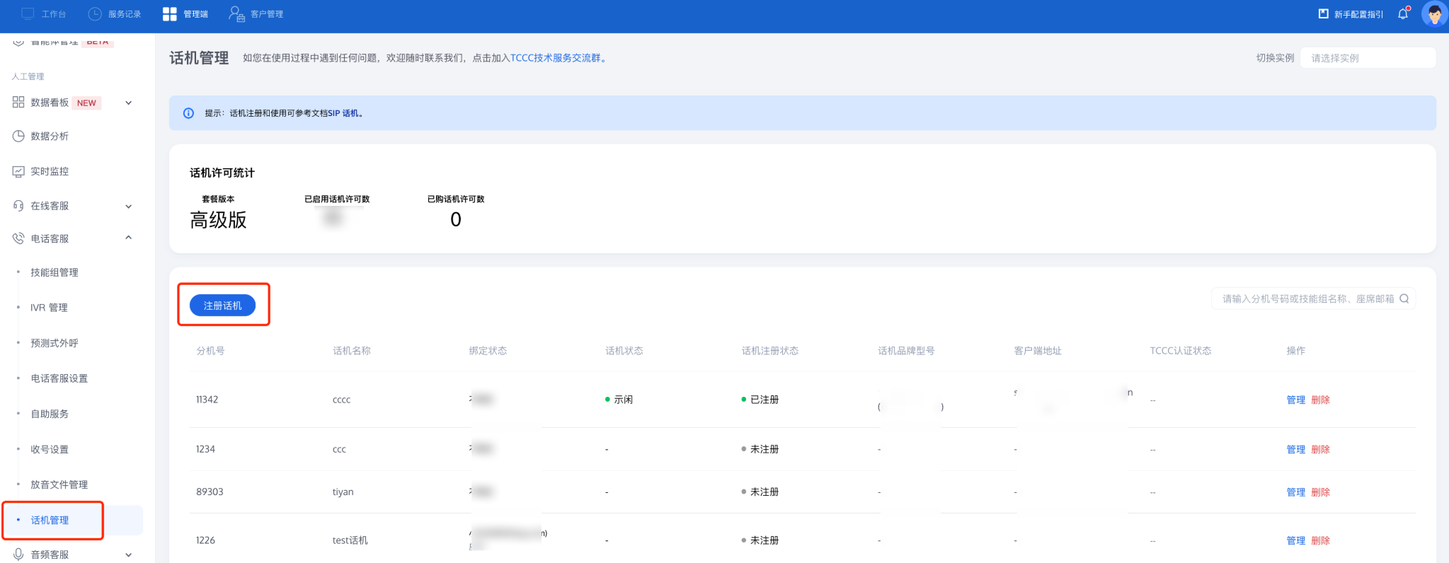2. 左侧导航栏单击电话客服 > 话机管理进入话机管理页面,左上角单击注册话机。