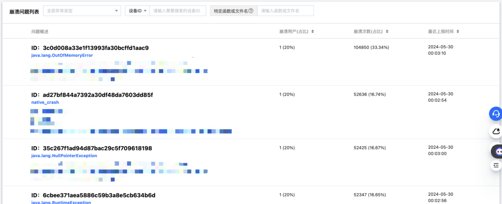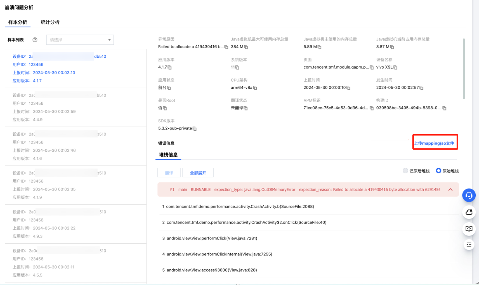 利用已上报的数据个例,根据个例页面的构建 ID 找到对应的符号表后完成上传,需要注意对已上报的问题样本不会再自动做重新翻译处理,针对这些样本可以点击手动翻译以实现反混淆。