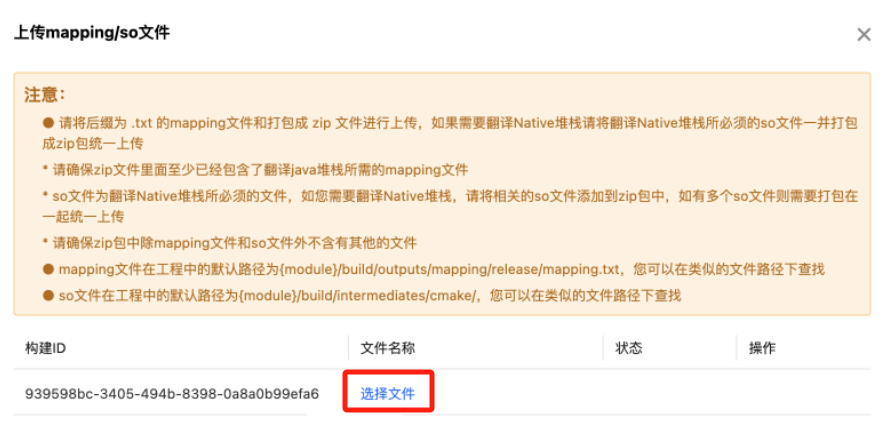 3. 进入符号表上传页面,单击选择文件,然后选择该构建 ID 对应的 maping 文件&so 文件打包的 zip 压缩包即可。该构建 ID 为初始化时