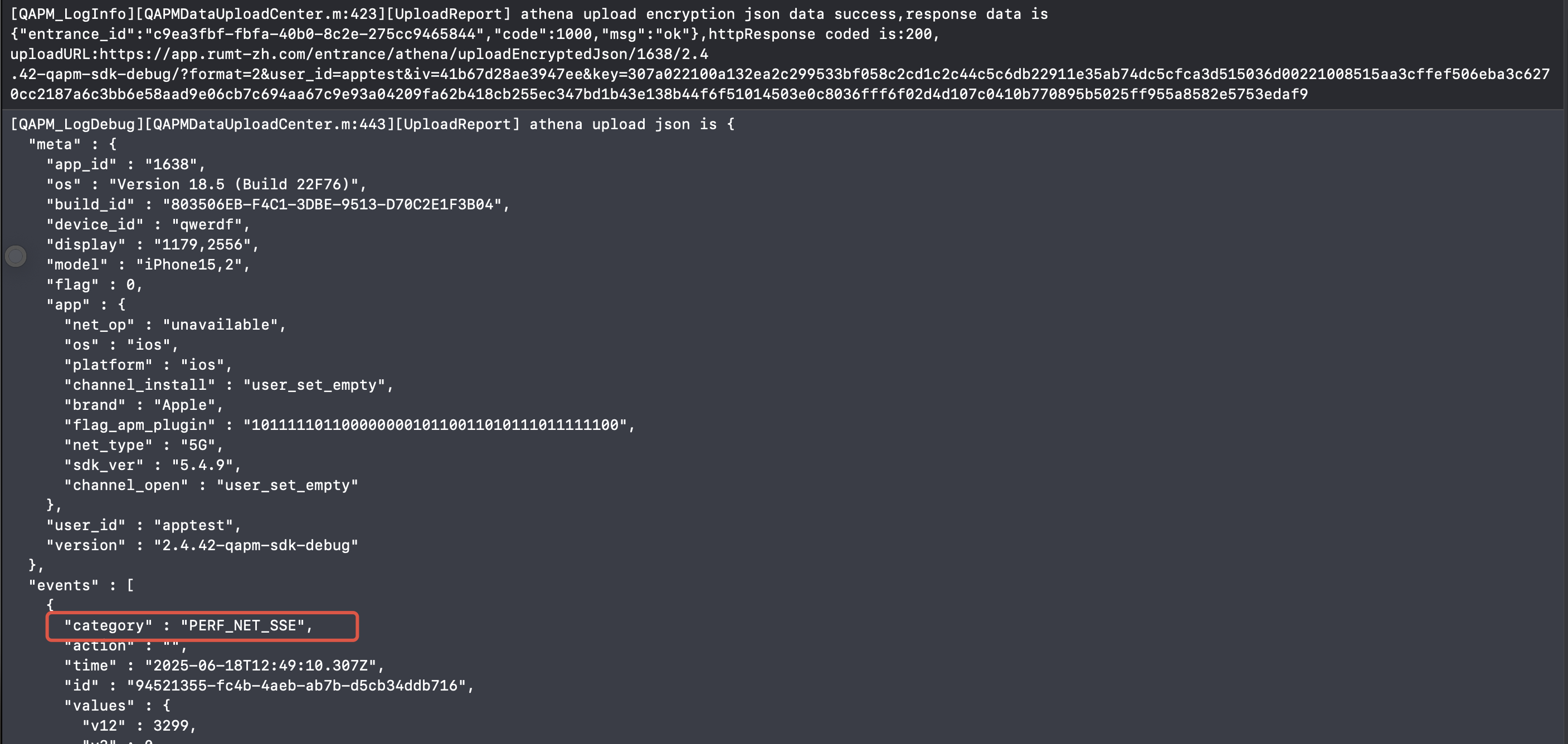 大模型 SSE 监控数据请求一条上报一条,如打印以下日志,则代表大模型 SSE 监控数据上报成功。