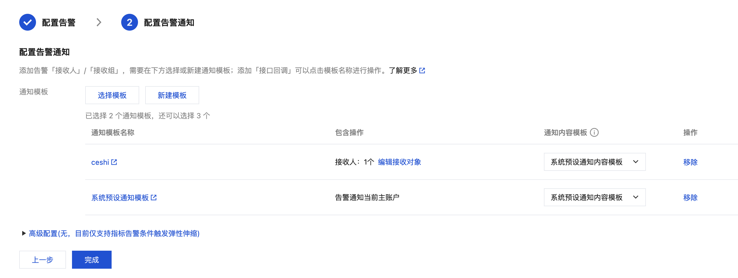 配置告警通知的接受渠道和接收对象,然后单击