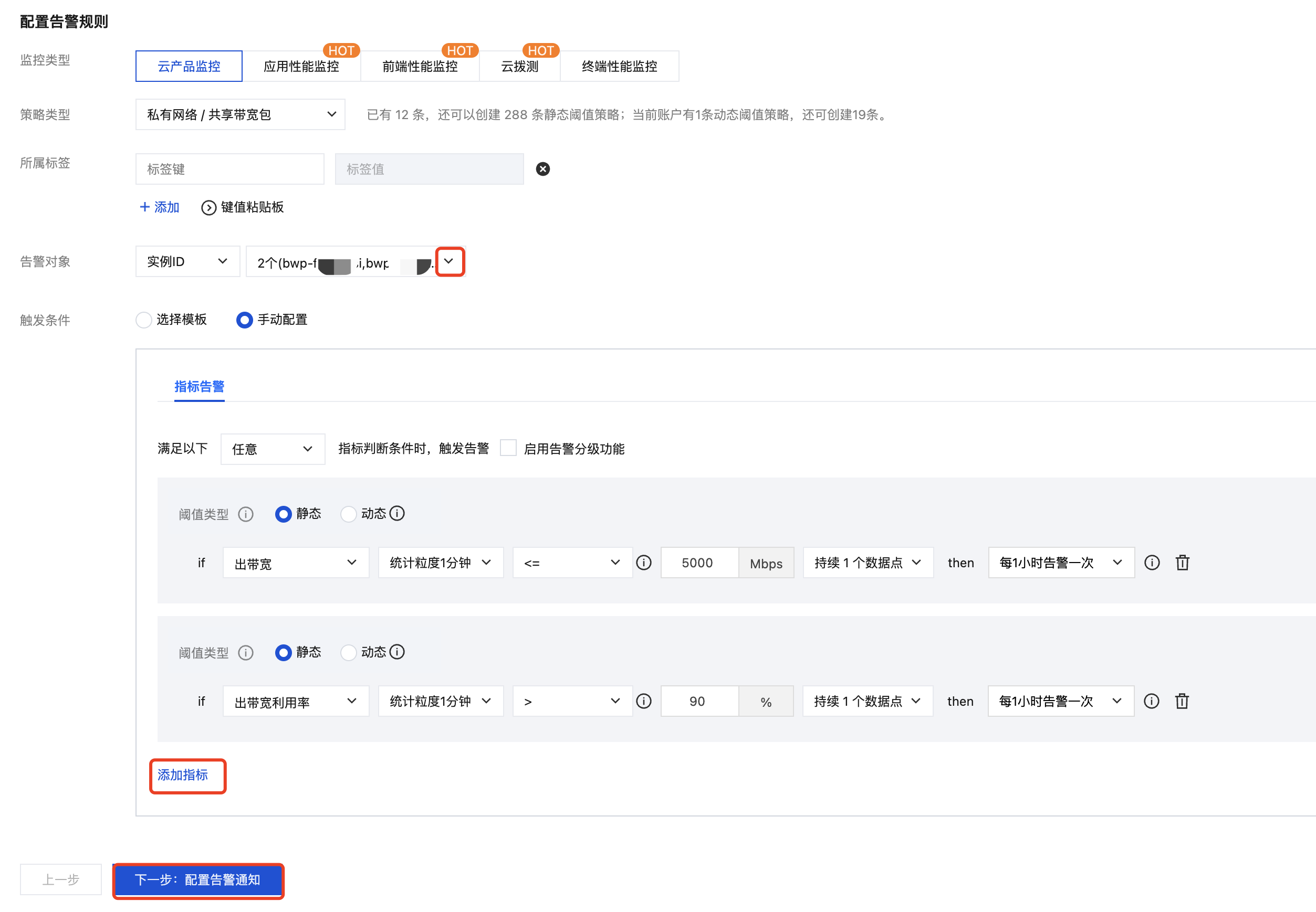 选择需要配置告警的指标,并设置告警触发条件。完成后单击