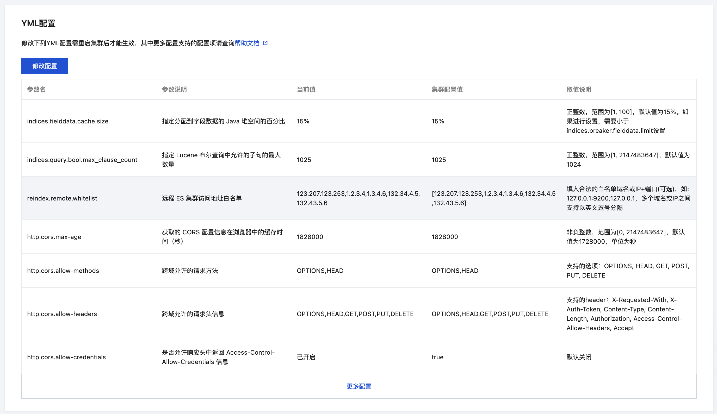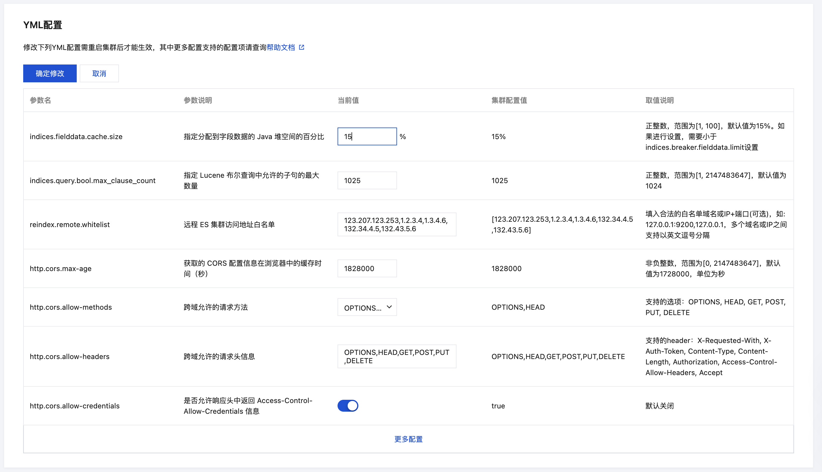 You can configure common parameters by modifying the YML parameter configurations of your Tencent Cloud Elasticsearch Service (ES) instance.