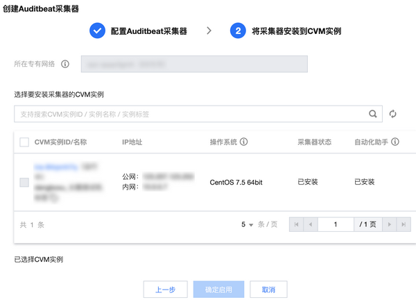将采集器安装到 CVM 实例。选择要安装采集器的 CVM 实例,完成后单击确定启用。