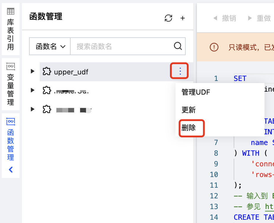 2. 在函数管理列表中,鼠标悬停在目标UDF名称上,单击删除。