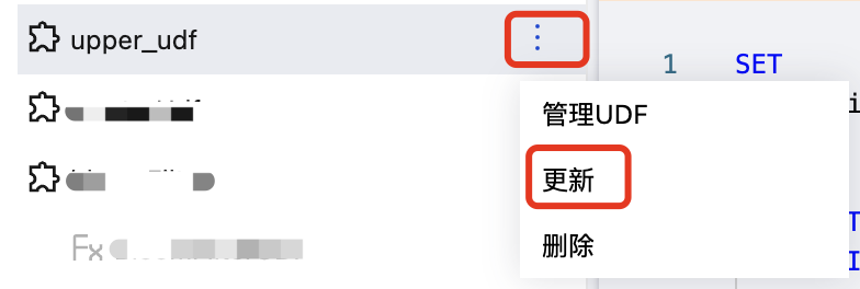 2. 在函数管理列表中,鼠标悬停在目标UDF名称上,单击更新。