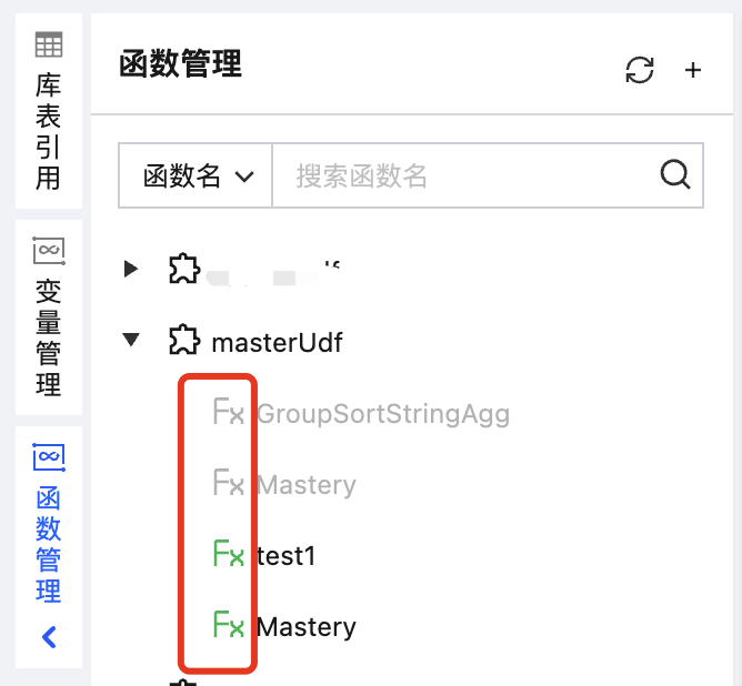 Flink 开发控制台会解析自定义函数文件中是否使用了 Flink UDF、UDAF 和 UDTF 接口的类,并自动提取类名,填充到 Function Name 字段中。注册成功后,您可以在左侧函数列表看到所有注册成功的 UDF,注册成功的 UDF 左侧会有绿色字体的 Fx 标识。