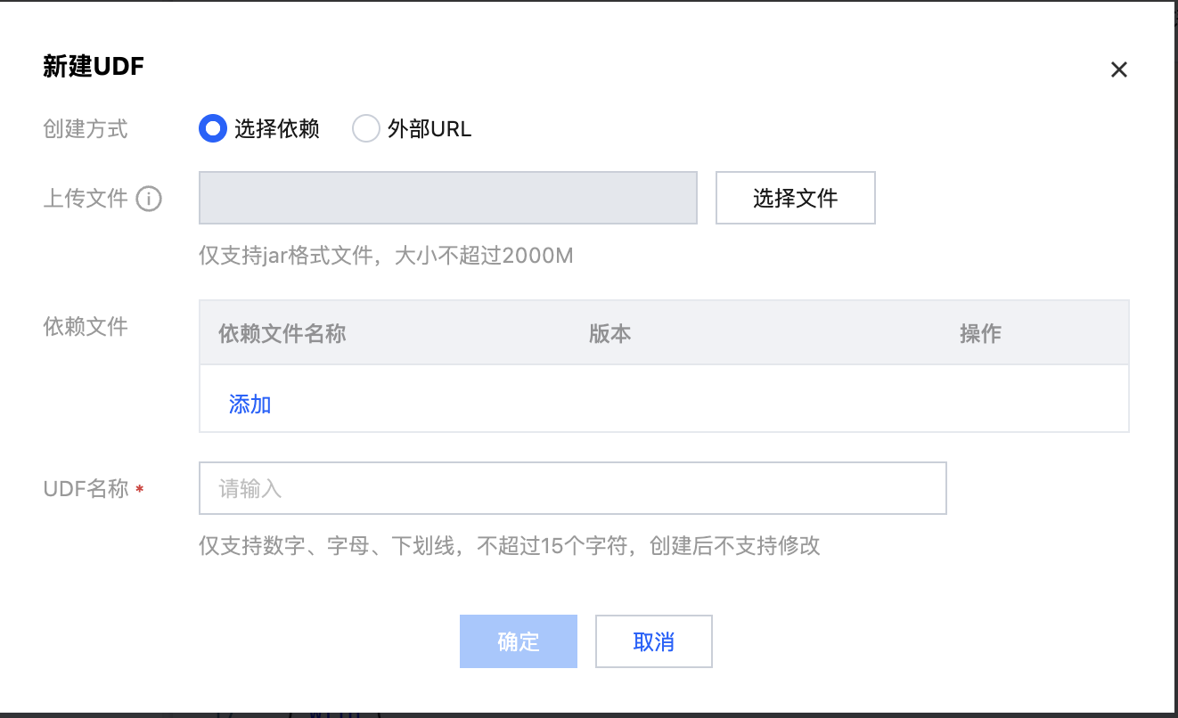 依赖文件:当需要使用依赖管理上存在的 JAR 文件时,可以依赖文功能获取 UDF 文件。
