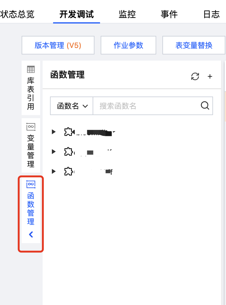 1.3 切换到开发调试,在左侧的函数管理界面操作。