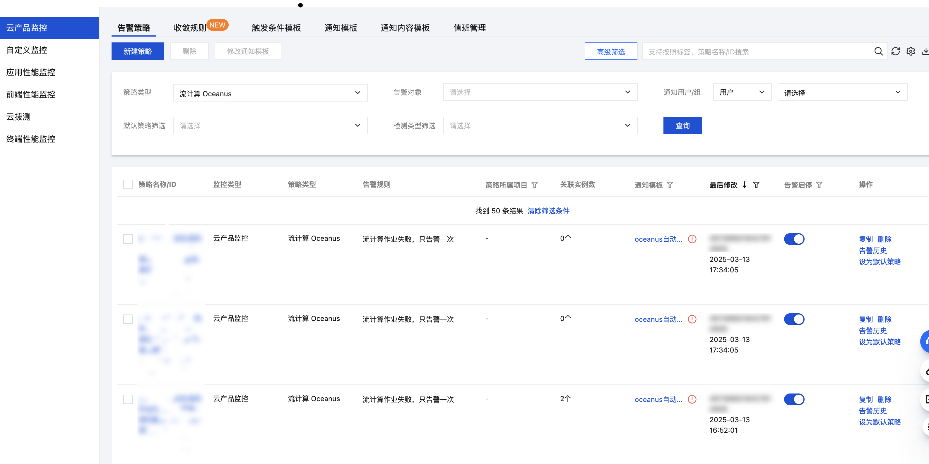 在 腾讯云可观测平台控制台 中选择告警管理 > 告警配置 > 告警策略,默认可以查看所有产品的告警策略配置。在页面右上角点击高级筛选,监控类型选择云产品监控,策略类型选择“流计算 Oceanus”,即可查看所有为流计算作业配置的告警项。