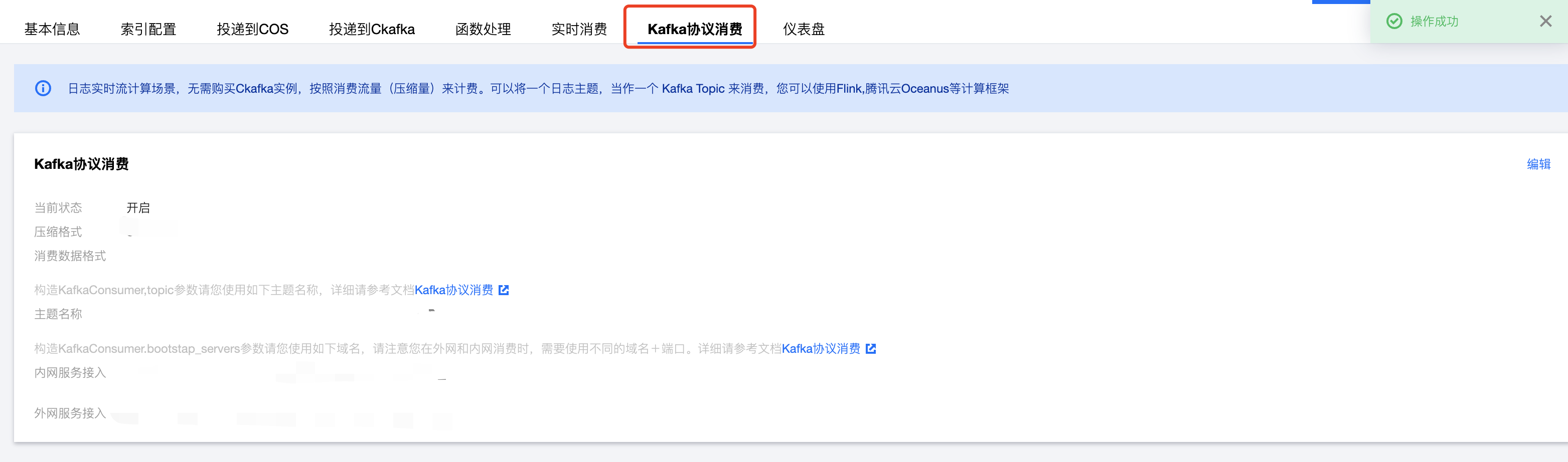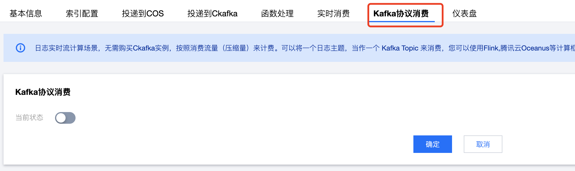 3. 建立 CLS Source 端需要在详情页,切换到 Kafka协议消费页签,打开 Kafka 协议消费的功能。