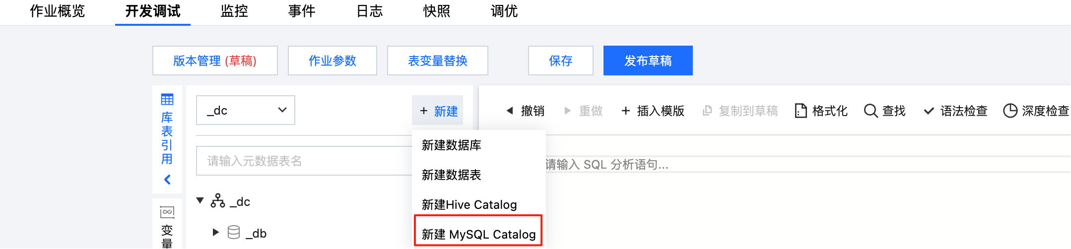 在 SQL 作业中,将光标移动到要插入的元表的位置,在左侧导航栏中找到要引用的表,点击菜单中的【引用】。