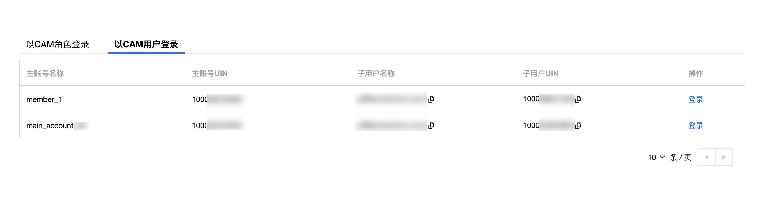 在以 CAM 用户登录页签,单击目标账号操作列的登录。