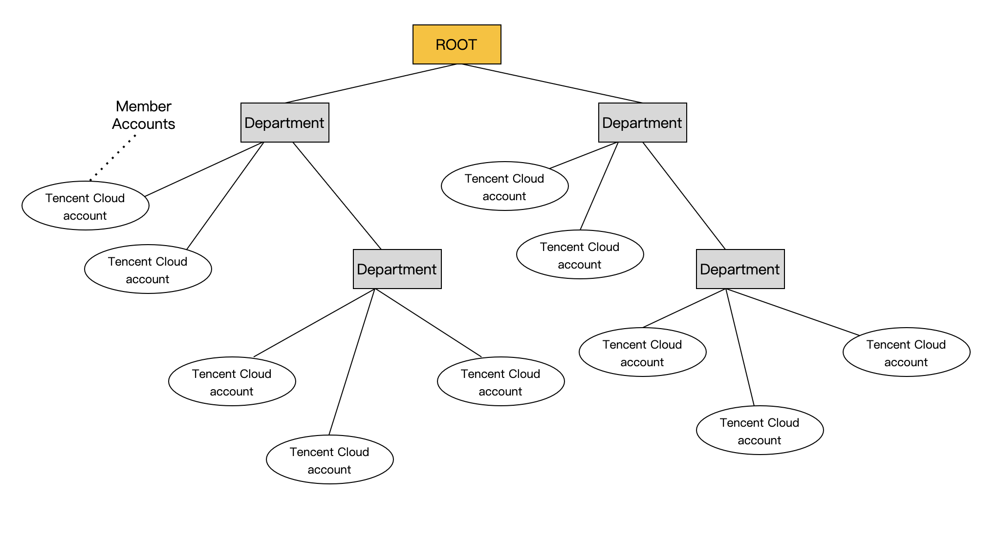 You can centrally view and manage all accounts within your organization through the Tencent Cloud Organization Console. An organization consists of one management account and multiple member accounts. You can organize accounts using a hierarchical tree structure, with the root node at the top and departments nested under the root node. Each account can be placed directly in the root node or within one of the hierarchical departments.