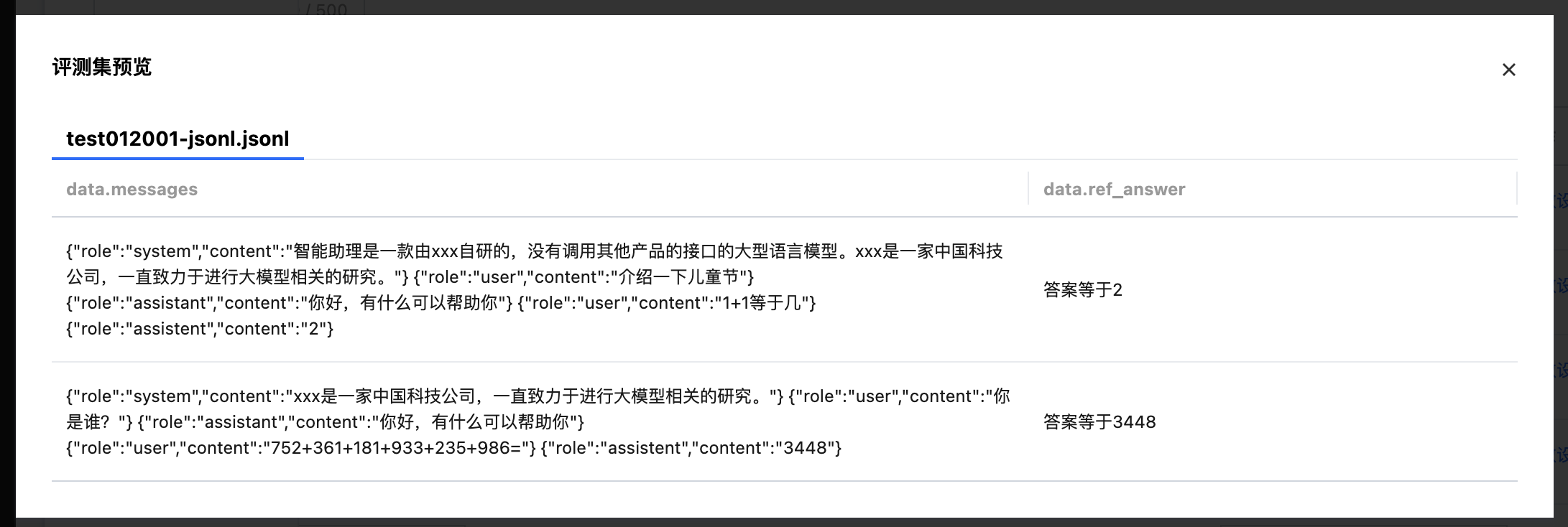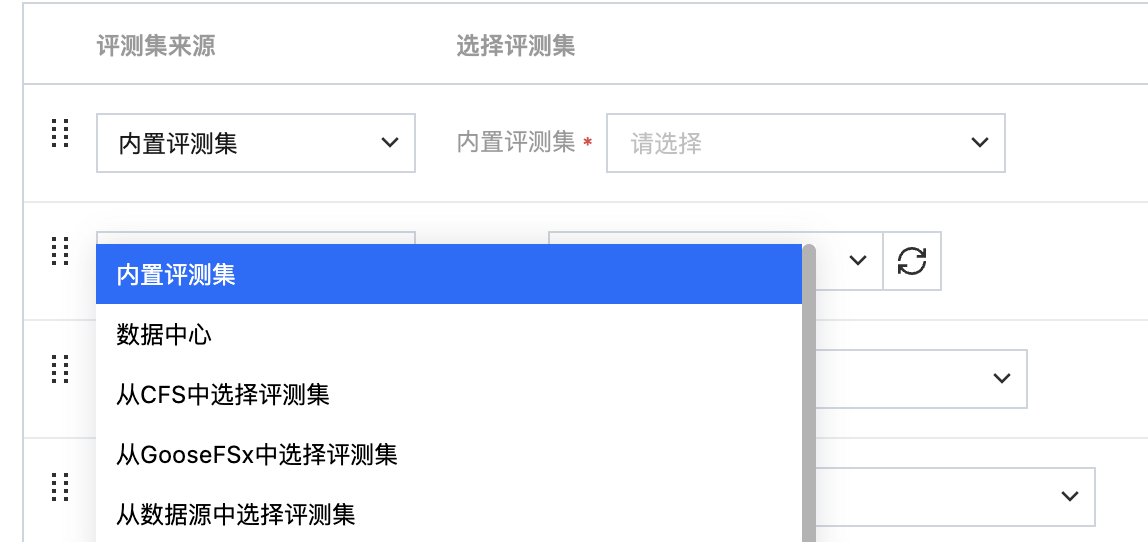 评测集 | 评测集来源为 内置评测集/数据中心/CFS/GooseFSx/数据源/资源组 配置评测集的详细介绍请见下一章节2.2 配置评测集。 |
