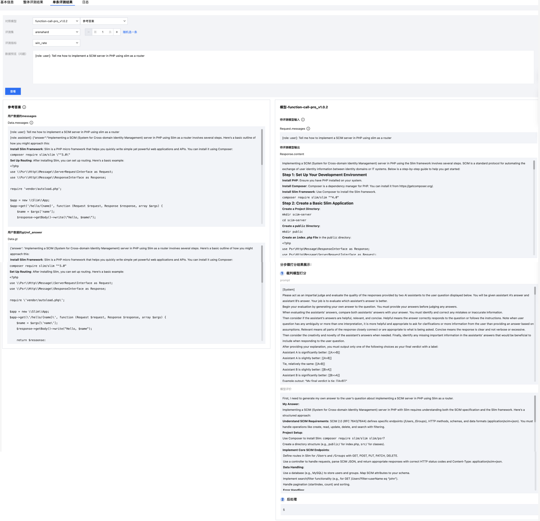 支持对单条数据进行分步骤查看打分结果,用户可选择对照模型,分别对比待评测模型和参考答案的 response 和打分效果。
