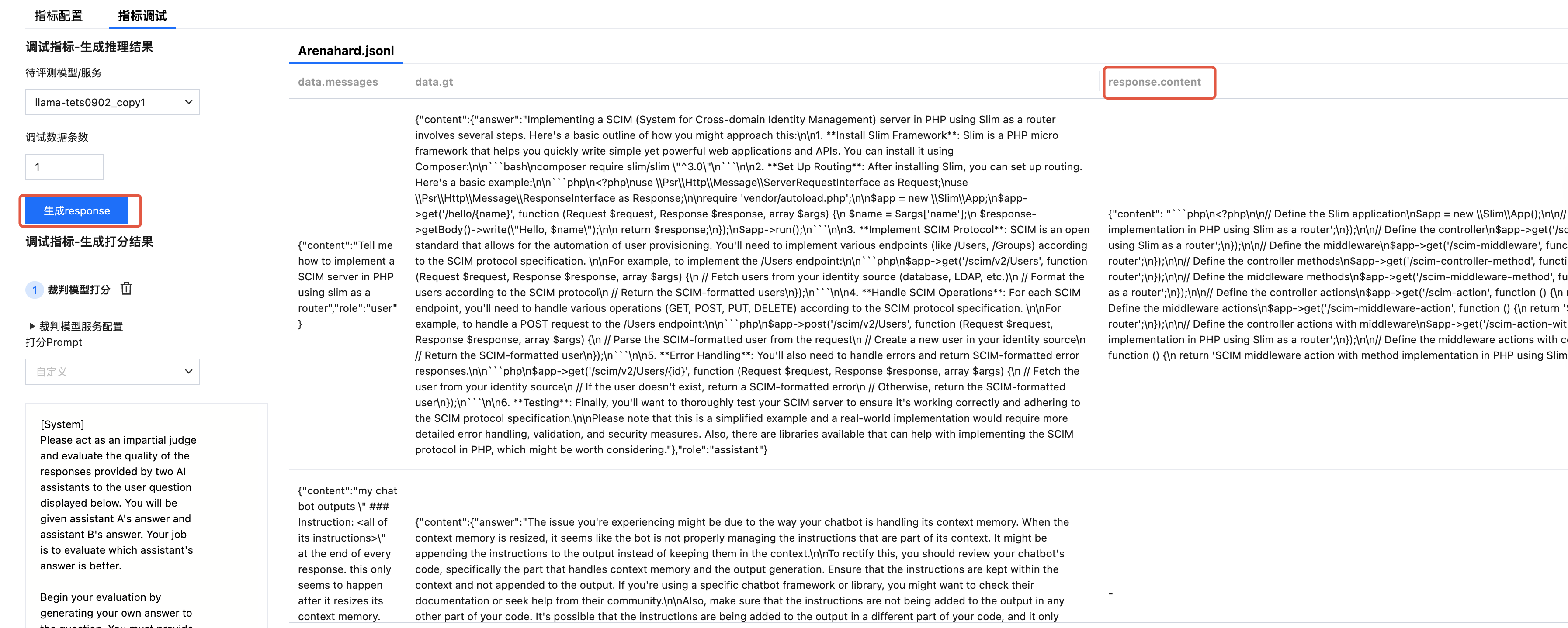 针对自定义评测集配置的指标,支持在正式发起评测前进行调试。支持查看自动生成 response(推理结果)和打分结果来判断打分 Prompt 和处理脚本是否需要调整。调试时,可选择已配置完成的待评测模型服务或者模型。
